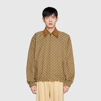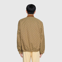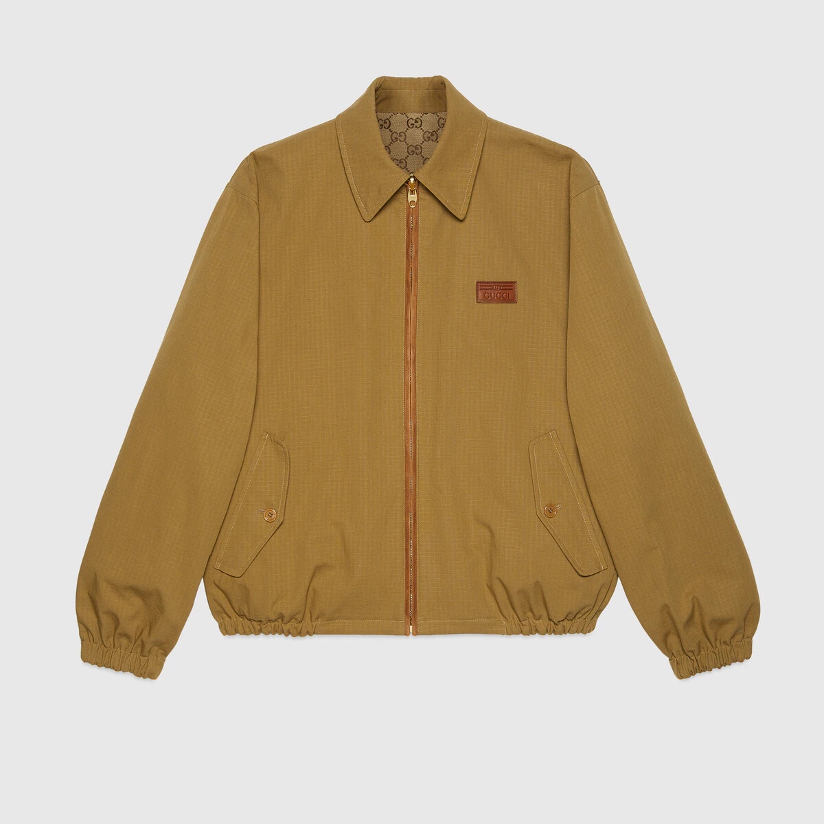 A reversible GG jacket has a Gucci vintage logo patch on one side. The Gucci vintage logo reappears for the Ouverture collection. Presented as patches, embroideries and prints, the symbol was first introduced in the 1970s. - Light brown cotton nylon ripstop with leather Gucci vintage logo patch on one side - Beige and brown GG cotton nylon ripstop on the other side - Pointed collar - Front button flap pockets - Gathered hem and cuffs - Zipper closure - Made in Italy - The model is 6'1" tall. The product shown in this image is a size 48 (IT)