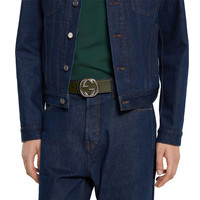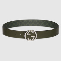 In the Fall Winter 2025 collection, the GG Monogram coated fabric offers a fresh take on one of the House's signature motifs. Here it appears on one side this reversible belt, with tonal green leather on the reverse. A detachable Interlocking G buckle further defines the silhouette. - Forest green GG Monogram coated fabric on the one side, forest green leather on the other - Silver-toned hardware - Detachable Interlocking G buckle - 1.5" width - Made in Italy - Can be worn as a hip or waist belt. Sizing will differ based on where the belt is worn, please refer to the size guide to find your size.