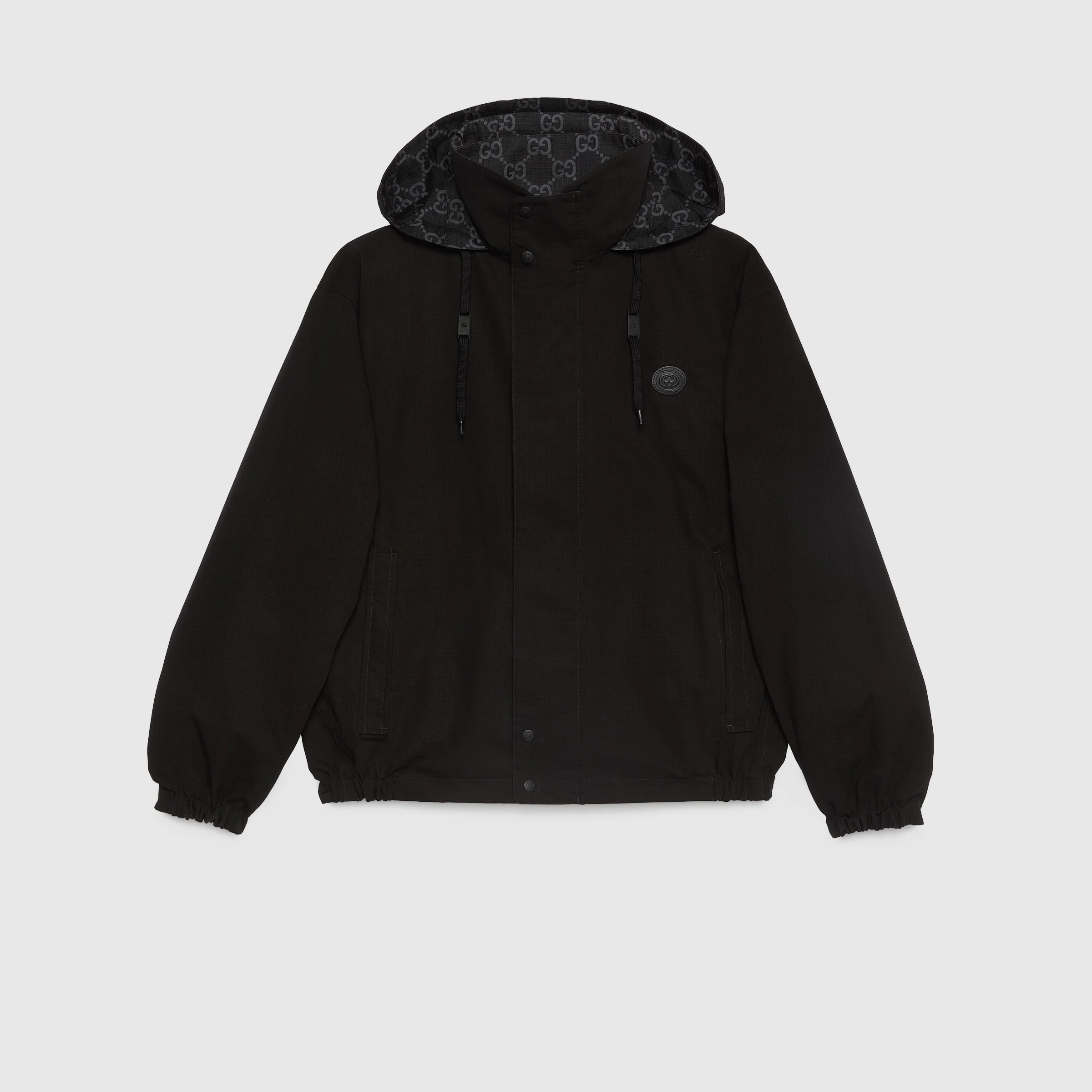 The men's Cruise 2024 collection presents a contemporary silhouette. Made from black and grey GG ripstop nylon, this off-duty reversible jacket reveals a hidden hood and a leather patch. - Black ripstop nylon on one side - Black and grey GG ripstop nylon - Oval leather Interlocking G patch - Reversible - High neck - Hidden hood - Long sleeves - Two side pockets - Elastic cuffs - Zip closure - Length: 27.5", based on a size 48 (IT) - Made in Italy - The product shown in this image is a size 48 (IT)