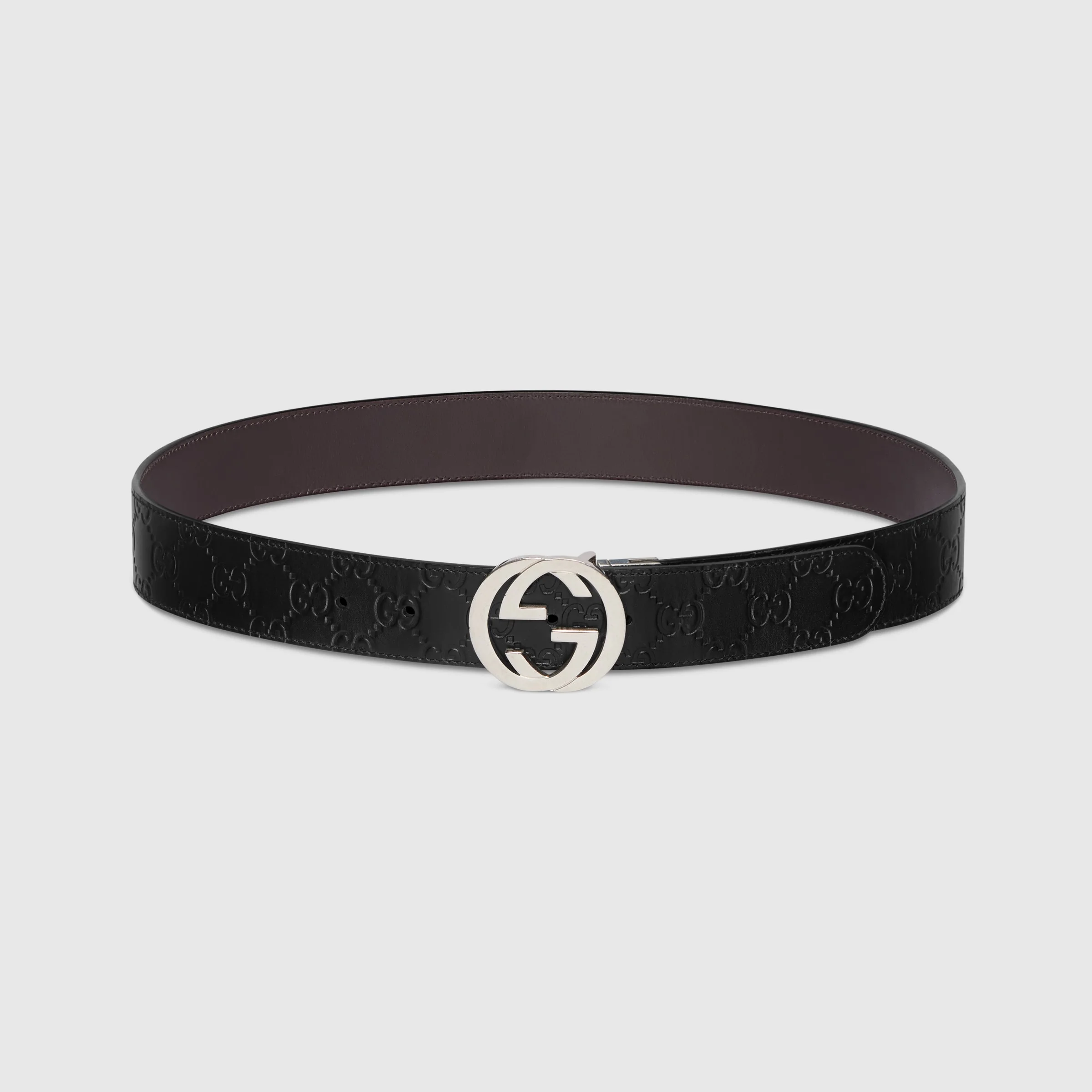 A reversible belt with Gucci Signature leather on one side and solid leather on the reverse. Finished with the interlocking G buckle. - Black Gucci Signature leather reverses to brown leather - Palladium-toned hardware - Interlocking G buckle - 1.5" width - Made in Italy - Can be worn as a hip or waist belt. Sizing will differ based on where the belt is worn, please refer to the size guide to find your size.