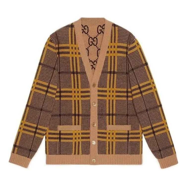 With an undeniable ‘70s attitude, sophisticated patterns decorate a selection of styles for the Gucci Love Parade collection. Vintage elements still permeate the House's aesthetic, blending seamlessly with the contemporary for an updated yet never-out-of-style wardrobe. This reversible knit wool cardigan changes from a checked pattern to the GG pattern. - Camel and brown double checked knit wool on one side and camel and brown GG on the other side - Front pockets - Front button closure - 65cm length, based on a size medium - Made in Italy - The product shown in this image is a size medium