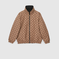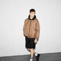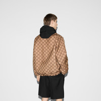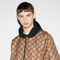 '90s elements still permeate the House's aesthetic, blending seamlessly with the contemporary for an updated yet never-out-of-style wardrobe. This reversible poplin jacket changes from solid black with piping detail to the GG canvas. - Black polyester poplin on one side with piping and green and red detail - Beige and ebony GG canvas on the other - Hooded with drawstring - Front zip with covered button closure - Front pockets - Made in Italy - The product shown in this image is a size 54 (IT)