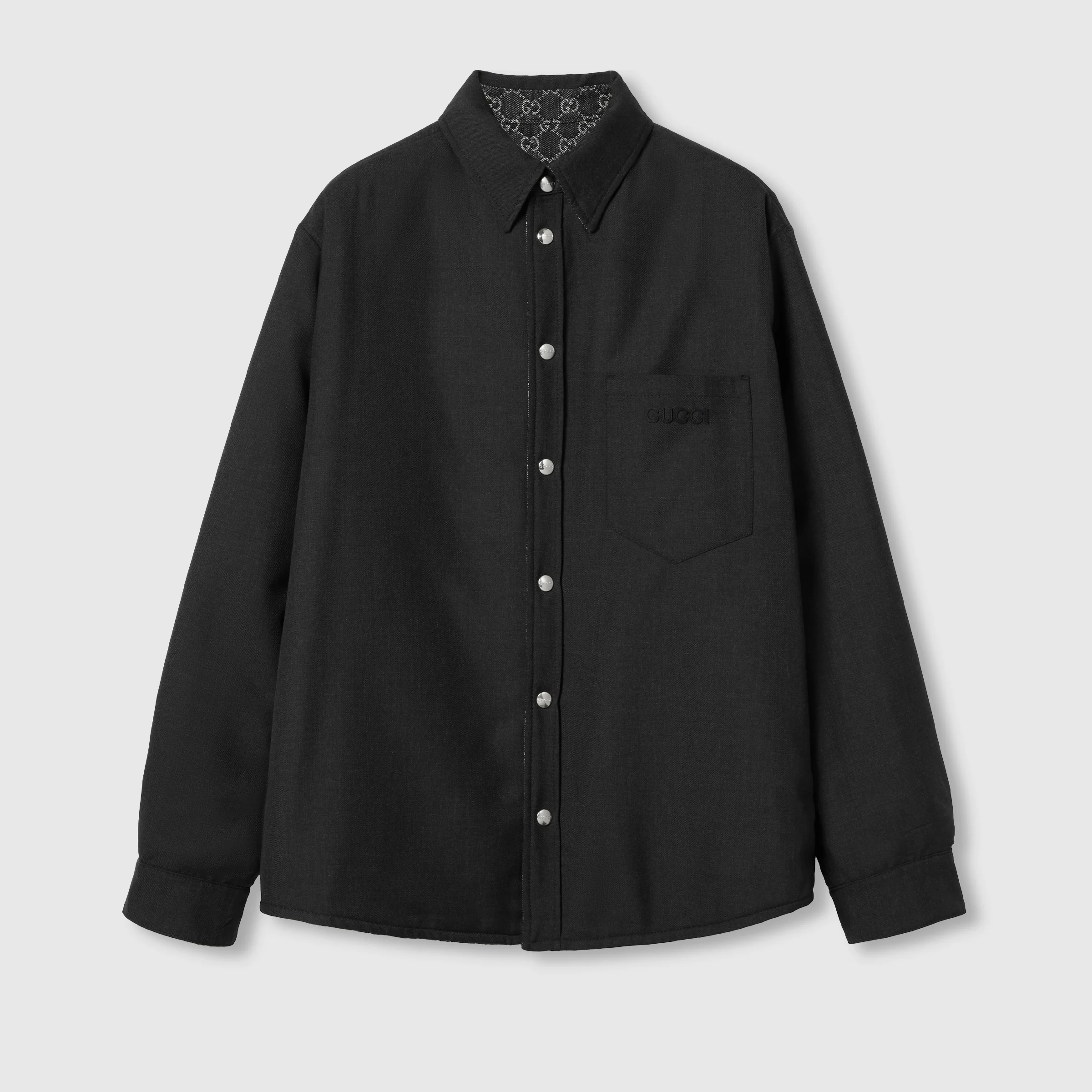 The Cruise 2025 collection introduces a fresh take on denim, with subtle details that elevate everyday looks. This reversible shirt is presented in a polyester and wool twill on the one side, revealing a GG cotton denim jacquard on the other. A subtle Gucci embroidery completes the piece. - Black polyester and wool twill on the one side - Dark grey and black GG cotton denim jacquard on the other - Gucci embroidery on one side - Point collar - Dropped shoulder - Long sleeves - Patch pocket - Snap button closure - Length: 31.4", based on a size 48 (IT) - Made in Italy - The model is 6'1" and is wearing size 48 (IT)