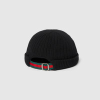 The House's silk accessories collection continues to reinterpret emblematic motifs, from the GG, Web, Flora, bamboo, Horsebit and equestrian inspirations, in sumptuous materials, intricate craftsmanship, and fresh hues. This rib knit wool hat features a Double G knit detail and an adjustable Web strap and buckle closure on the reverse. - Black and dark green rib knit wool - Double G knit detail - Web detail - Adjustable buckle closure - Main fabric: wool 100%; embroidery: polyester 100%; detail: polyamide 100%