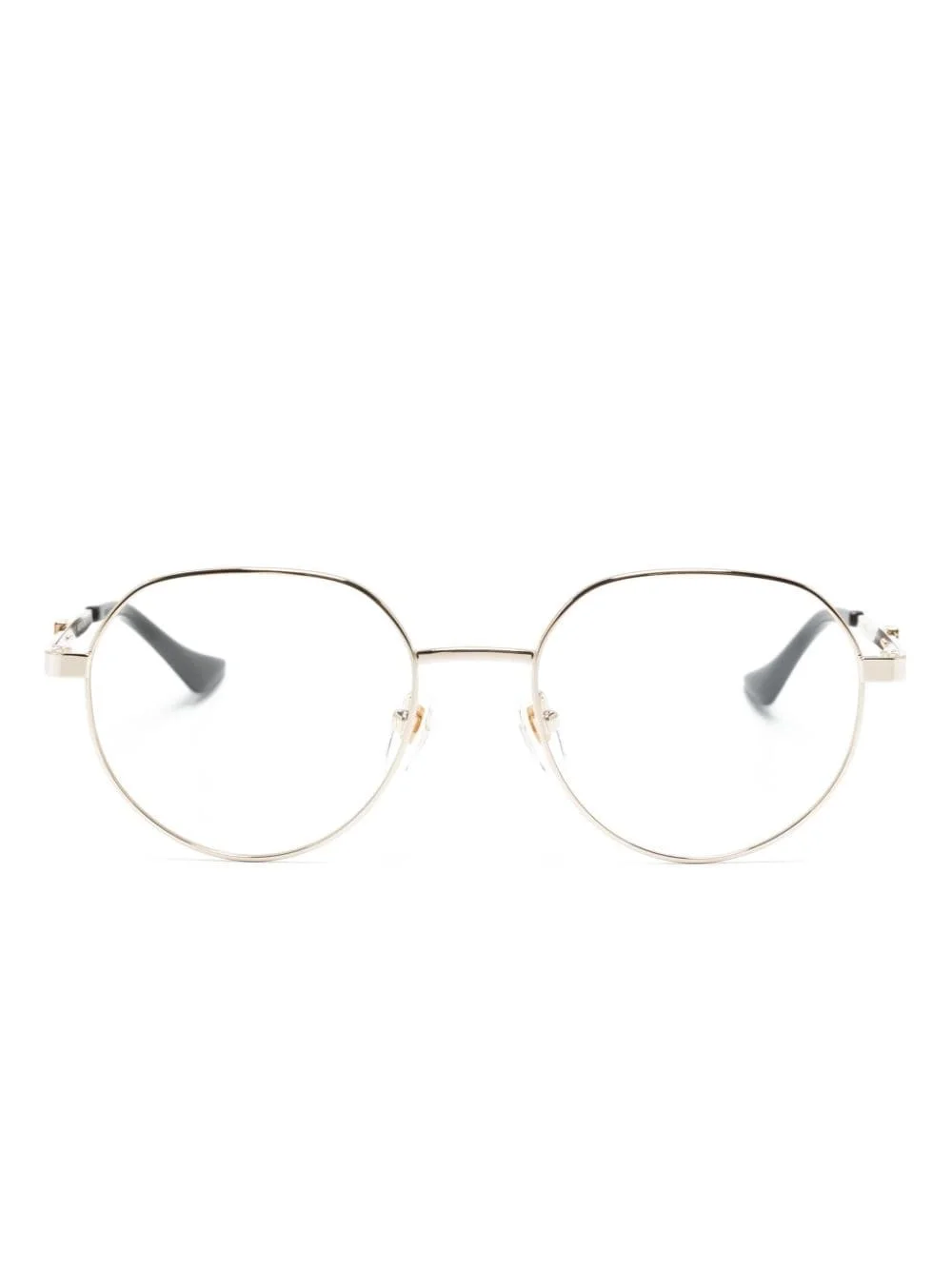 round-frame glasses Highlights - Gold-tone - Titanium/acetate - Round frame - Clear lenses - Nose pads - Logo-debossed arm - Signature web-stripe detailing at the arm - Straight arms with curved tips - These glasses come with a protective case. - All glasses from farfetch are sold as non-prescription frames. Made in Italy Composition Titanium 90%, Acetate 10% SIZE & FIT Measurement Arm Length 5.7 in(14.5 cm) Bridge Width 0.74 in(1.9 cm) Lens Diameter 2.04 in(5.2 cm) Total Width 5.31 in(13.5 cm)
