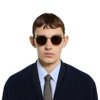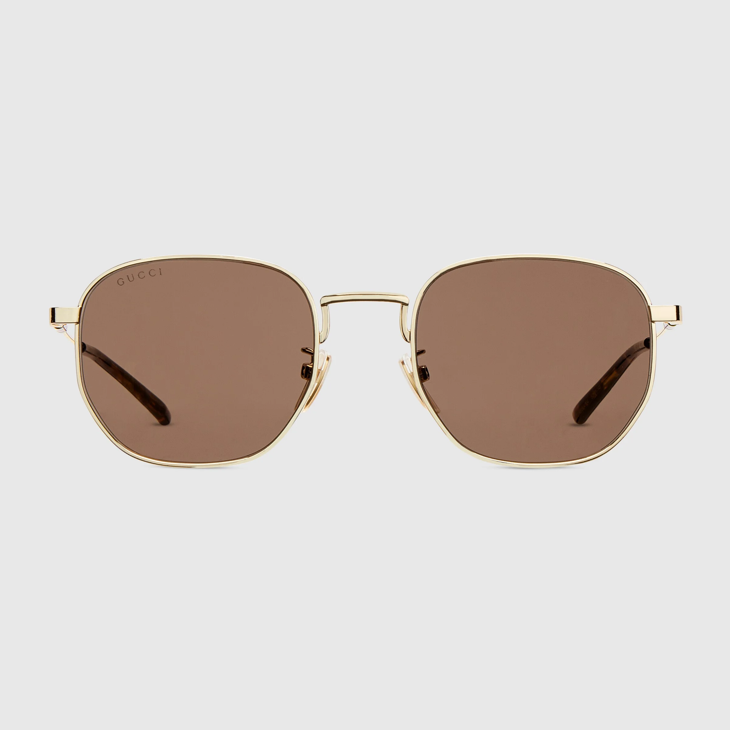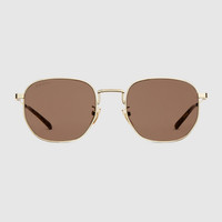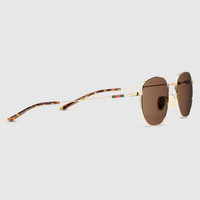 The House's eyewear collection continues to reinterpret emblematic motifs, from the GG, Web, bamboo, Horsebit and equestrian inspirations, in sumptuous materials, intricate craftsmanship, and fresh hues. Set in a gold-toned metal frame, these round sunglasses reveal a Web detail across the temples. - Shiny gold-toned metal frame - Shiny gold-toned metal temples with Web detail and brown tortoiseshell acetate end tips - Brown lens - 100% UVA/UVB protection - Adjustable nose pads - GG2095S - Temple length: 5.7"; Lens height: 1.7"; Nose bridge length: 0.8" - Frame height: 5.4"; Frame width: 1.8"; Hinge to hinge: 5.3" - The eyewear case in the House’s signature Rosso Ancora red hue is complete with a magnetic closure and white interior