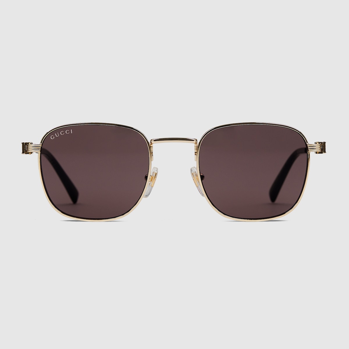 The Cruise 2025 eyewear collection blends a round silhouette and signature motifs in a classic design. These sunglasses feature a metal frame, engraved Gucci logo, and Web detail on the temples. - Shiny gold-toned metal frame - Shiny gold-toned metal temples with Gucci Web detail and engraved Gucci logo - Solid brown lens - 100% UVA/UVB protection - GG1876S - Temple length: 5.7"; Lens height: 1.8"; Nose bridge length: 0.7" - Frame height: 1.8"; Frame width: 5.2"; Hinge to hinge: 5.1" - Made in Japan - The eyewear case in the House’s signature Gucci Rosso Ancora red hue is complete with a magnetic closure and white interior.