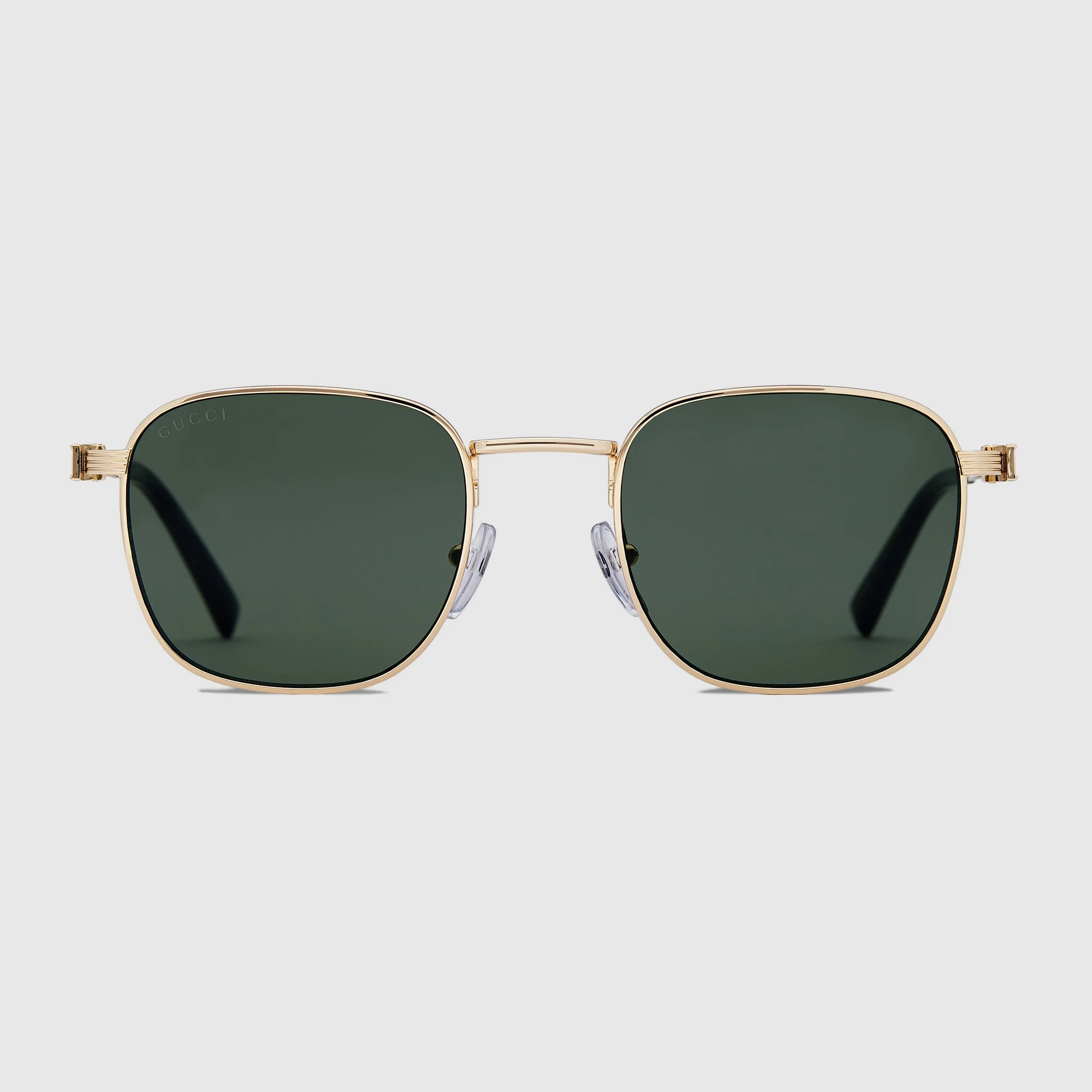 The Cruise 2025 eyewear collection blends a round silhouette and signature motifs in a classic design. These sunglasses feature a metal frame, engraved Gucci logo, and Web detail on the temples. - Shiny gold-toned metal frame - Shiny gold-toned metal temples with Gucci Web detail and engraved Gucci logo - Solid grey lens - 100% UVA/UVB protection - GG1876S - Temple length: 5.7"; Lens height: 1.8"; Nose bridge length: 0.7" - Frame height: 1.8"; Frame width: 5.2"; Hinge to hinge: 5.1" - Made in Japan - The eyewear case in the House’s signature Gucci Rosso Ancora red hue is complete with a magnetic closure and white interior.