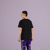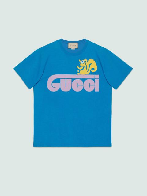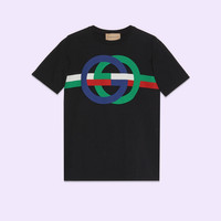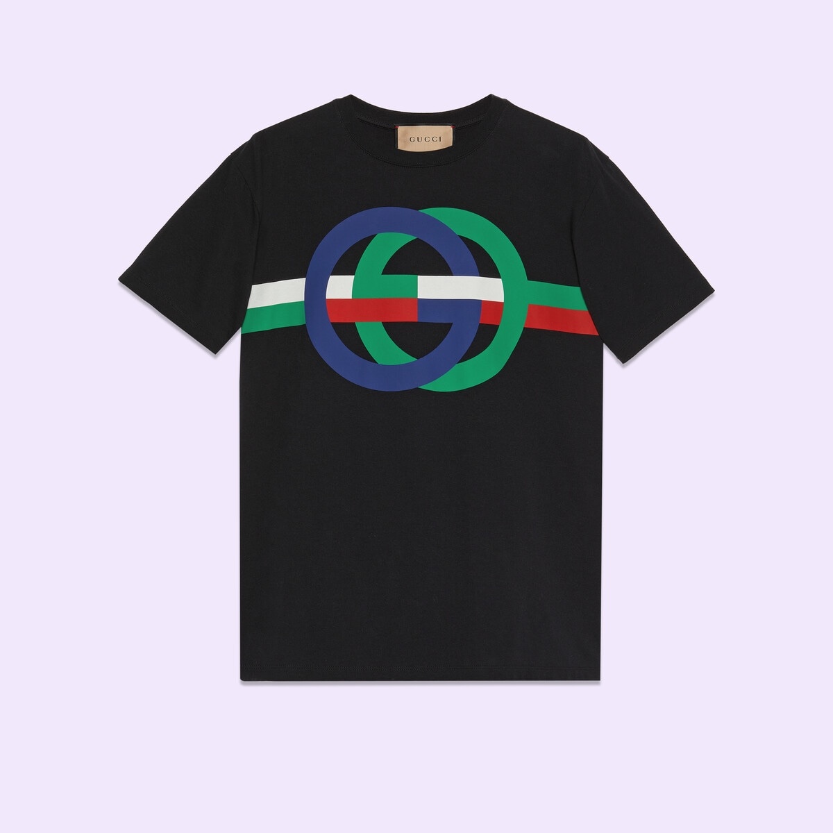 In each collection, the Gucci logo continues to evolve in new ways. The GG is presented in a range of colors that extend into stripes around this cotton jersey T-shirt. - Black cotton jersey - Round GG print - Crewneck - Short sleeves - Oversize fit - Made in Italy - The product shown in this image is a size small