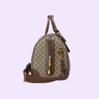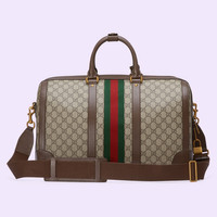 This Gucci Savoy duffle bag is crafted from the signature beige and ebony GG Supreme canvas. Two archival design elements, the Double G and the Web, complete the silhouette with a nod to the House Founder. An adjustable canvas shoulder bag adds versatility, allowing the bag to be worn over the shoulder. - Beige and ebony GG Supreme canvas - Brown leather trim - Gold-toned hardware - Green and red Web - Cotton linen lining - Double G - Detachable key holder, lock, and new personalized Liftboy ID tag - Inside: 2 zip pockets - Handle with 12cm drop - Adjustable canvas shoulder strap with 50cm drop - Zip closure - Weight: 2.4kg approximately - W44cm x H28.5cm x D24.5cm - Made in Italy - Weight: 2120.gr