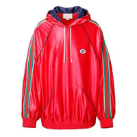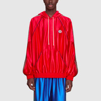 Shiny fabrics that challenge the rules find new purpose on familiar silhouettes throughout Ouverture. Here, this tracksuit-style hooded sweatshirt is constructed with supple shiny technical polyester jersey. The eye-catching bright red material serves as a canvas for emblematic details like the equestrian-inspired Web and Gucci vintage logo. - Bright red shiny technical polyester jersey - Interlocking G patch - Green and red Web detail - Net lining - Fixed hood with drawstring closure - Long sleeves - Front pocket - Ribbed hem and cuffs - Made in Italy - The model is 5'9" tall. The product shown in this image is a size medium