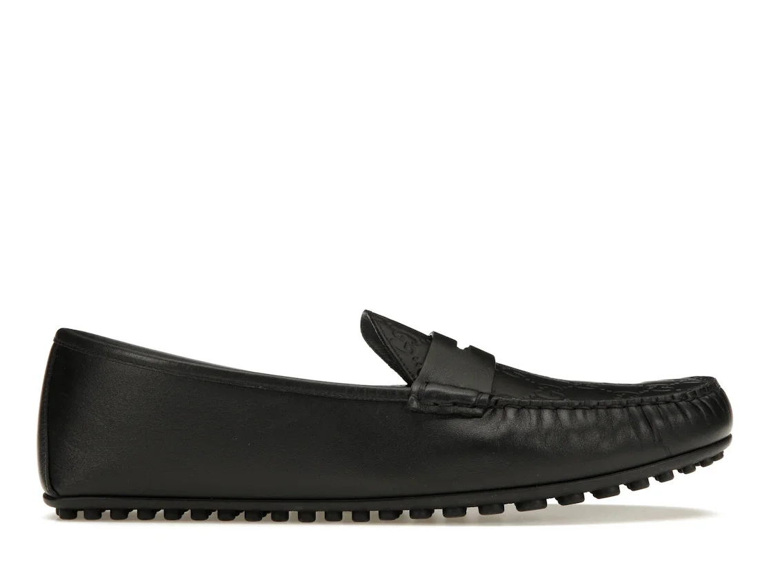 A driving shoe made in heat debossed Gucci Signature leather resulting in a defined print with a firm texture. - Black Gucci Signature leather with black leather details - Pebbled rubber sole - Flat - .2" height - Made in Italy