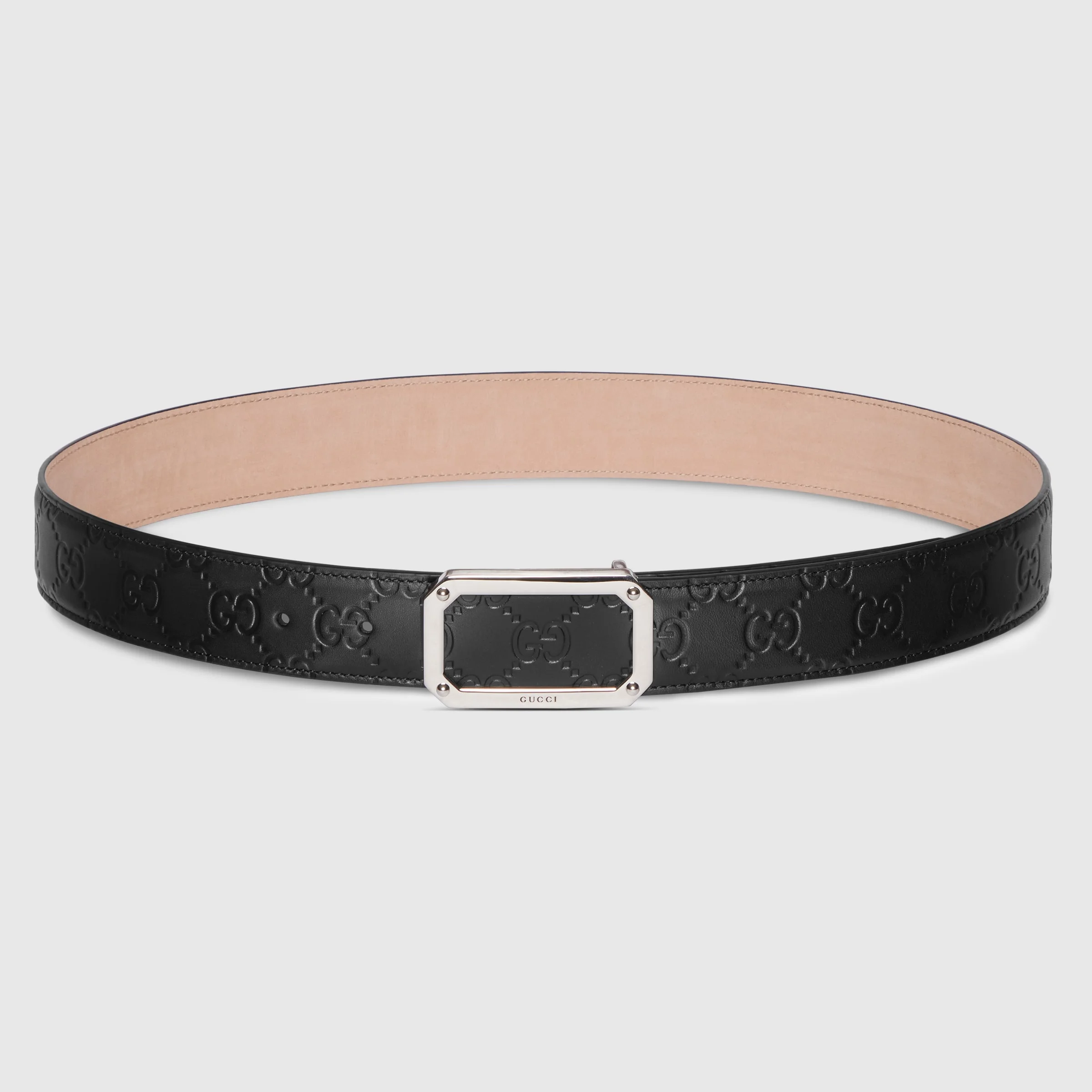 Belt with trademark rectangular buckle, made in heat debossed Gucci Signature leather resulting in a defined print with a firm texture. - Black Gucci Signature leather - Rectangular buckle with Gucci trademark - 1.5" width - Made in Italy - Can be worn as a hip or waist belt. Sizing will differ based on where the belt is worn, please refer to the size guide to find your size.