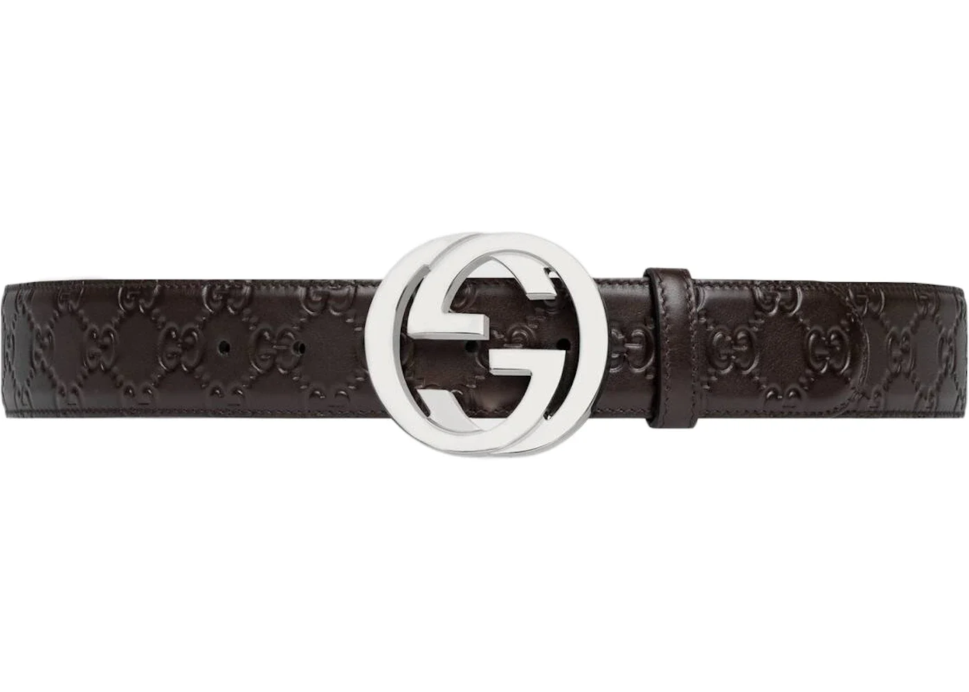 The Interlocking G buckle belt, made in heat debossed Gucci Signature leather with a defined print and firm texture. - Brown Gucci Signature leather - Palladium-toned hardware - Interlocking G buckle - 1.5" width - Made in Italy - Our belts are in Italian sizes, please refer to the belt size guide placing an order.
