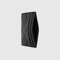 A slim card case made in heat debossed Gucci Signature leather with a defined print and firm texture. - Black Gucci Signature leather with black leather trim - Five card slots - Mini - 4"W x 3"H - Made in Italy
