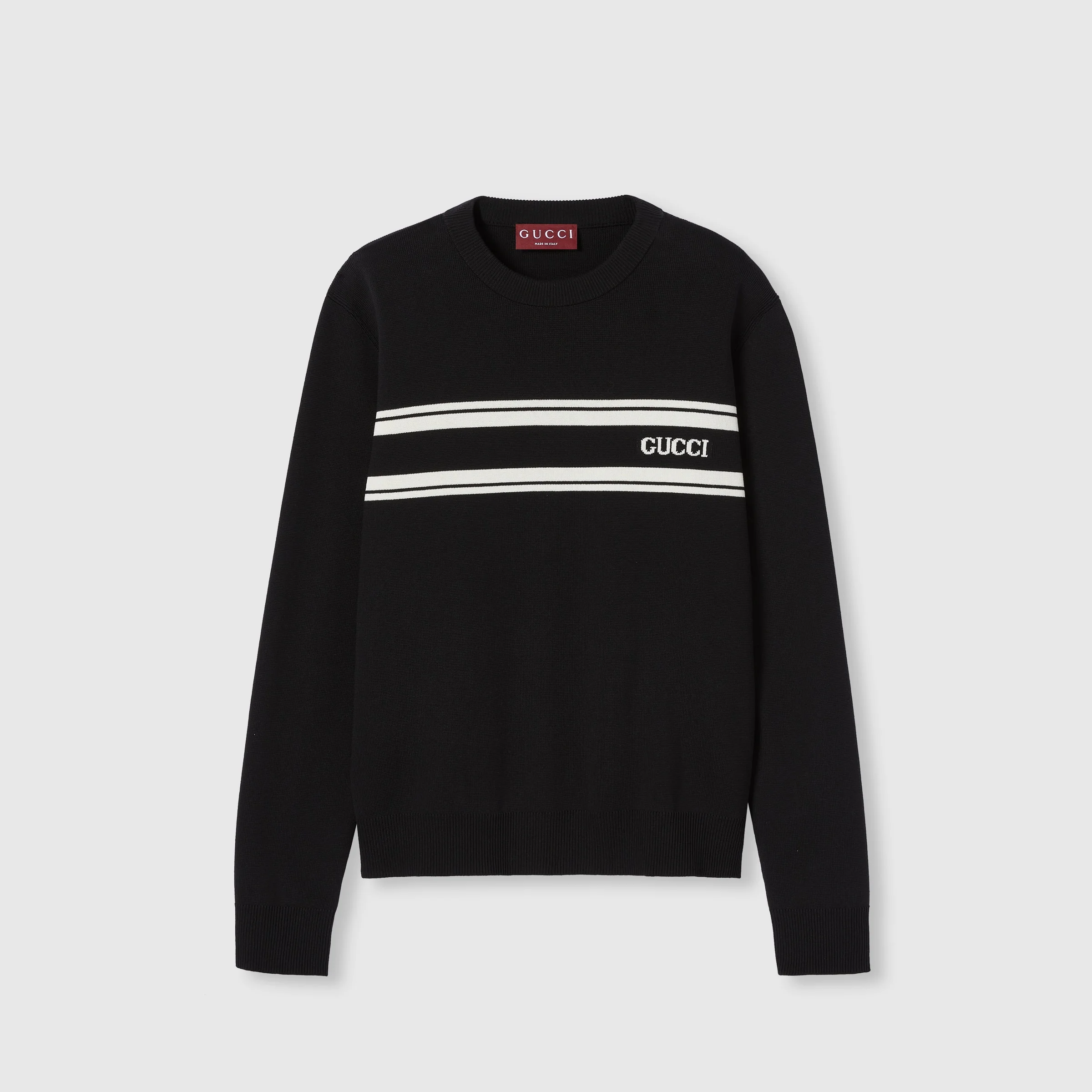 The Pre-Fall 2025 collection spotlights essential silhouettes with emblematic details from daywear to eveningwear. Crafted from black and white silk cotton knit, this sweater is enriched with a distinctive Gucci intarsia. - Black and white silk and cotton knit - Horizontal stripes with Gucci intarsia - Crewneck - Long sleeves - Rib trim - Made in Italy