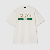 Introducing Spring Summer 2026. This style is inspired by the "Nerd" look of La Famiglia. The collection reinterprets the House’s codes through singular personalities and distinctive aesthetic attitudes. Crafted from silk blend jersey, this T-shirt is defined by a Gucci Web with Interlocking G print. - Off white silk blend jersey - Gucci Web with Interlocking G print - Crewneck - Short sleeves - Length: 27.1", based on a size S - Made in Italy