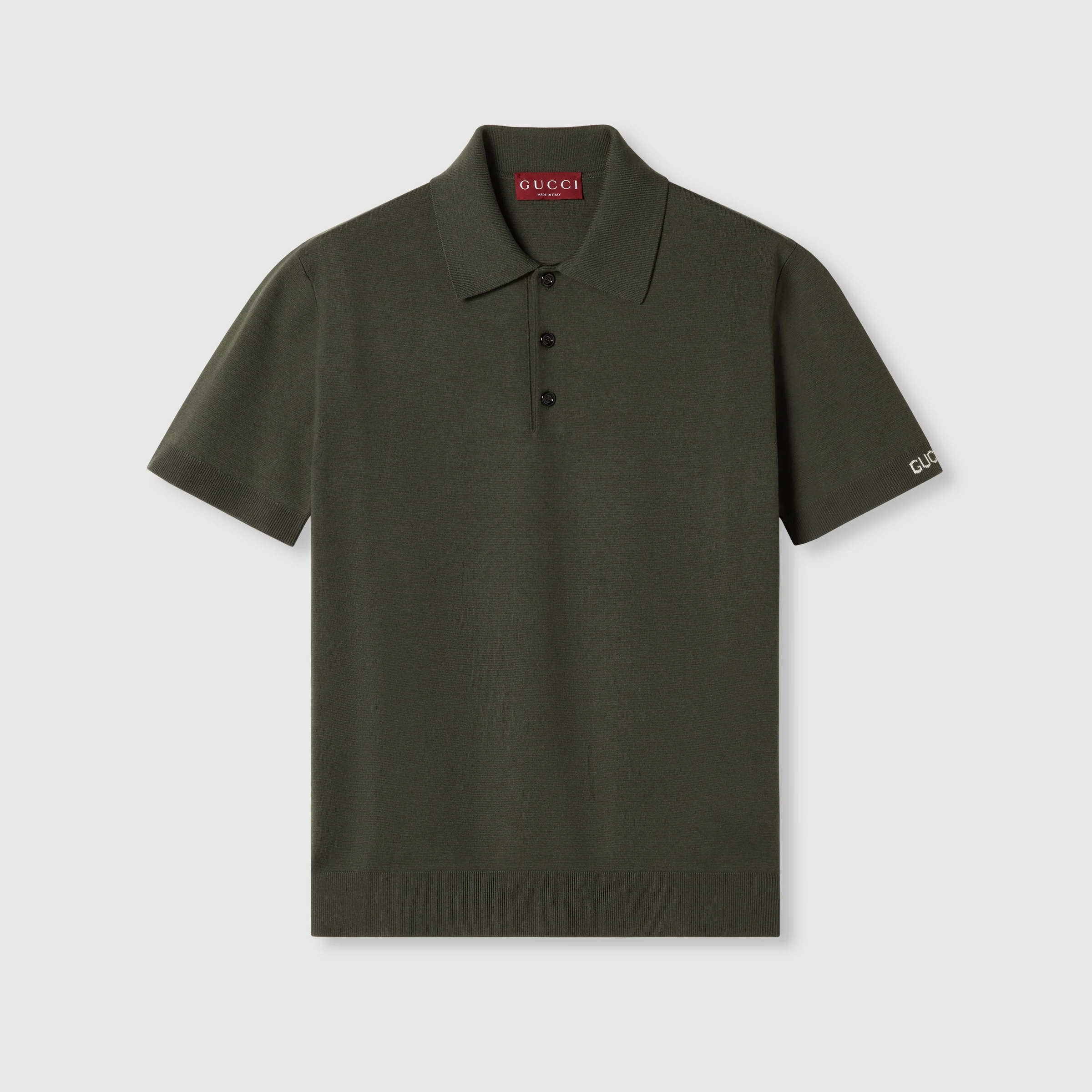 The Pre-Fall 2025 collection spotlights essential silhouettes with emblematic details from daywear to eveningwear. This classic polo shirt is presented in forest green silk cotton knit and is enriched with a Gucci intarsia on the sleeve. - Forest green silk cotton knit - Gucci intarsia - Point collar - Short sleeves - Rib trim - Shoulder drop: 17.3"; based on a size S - Chest: 19.6"; based on a size S - Sleeves length: 9.4"; based on a size S - Button closure - Length: 25.5"; based on a size S - Made in Italy