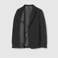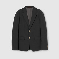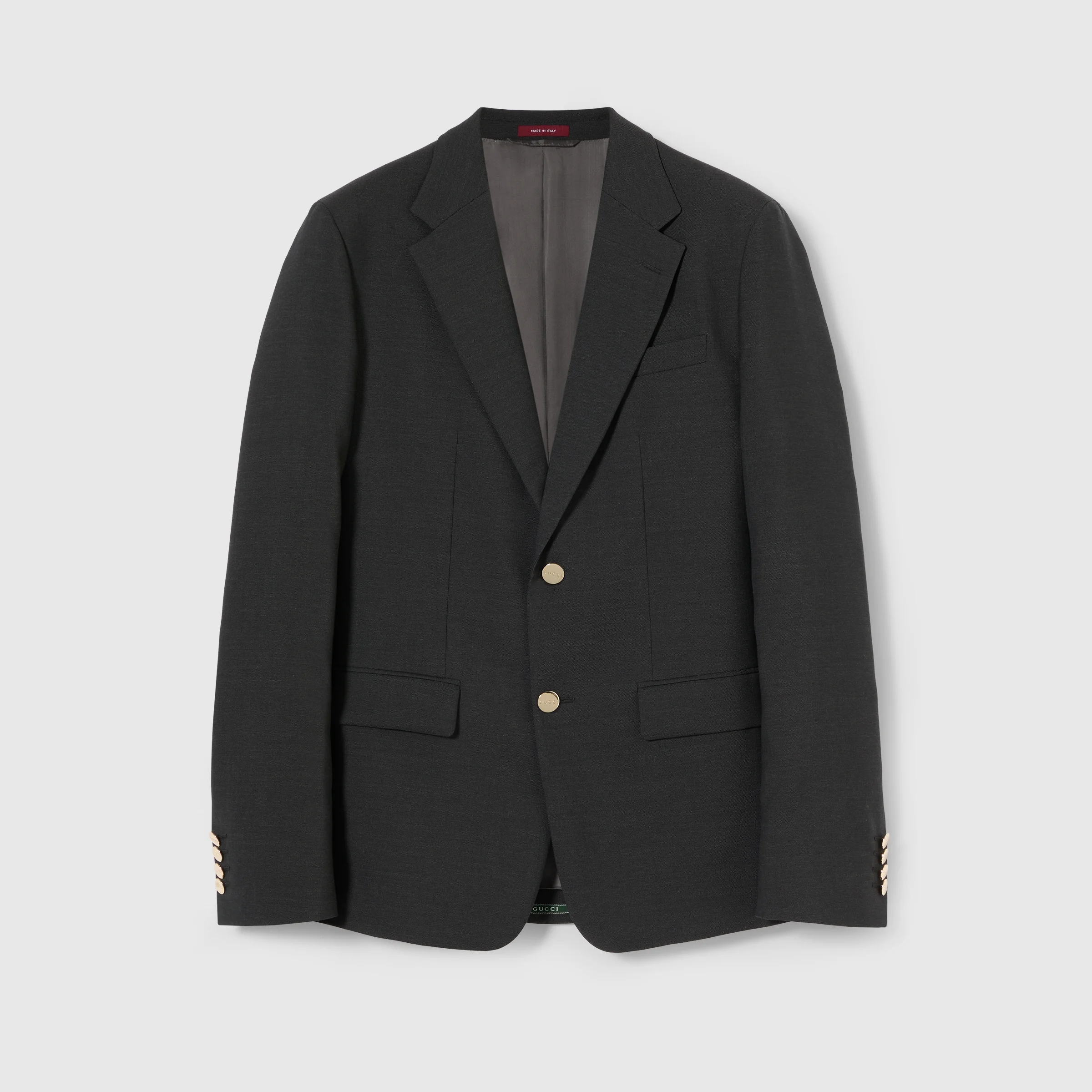 A refined touch that fuses technical precision with visual distinction, the Gucci selvedge is a subtle marker of craftsmanship. Crafted from dark grey wool, this jacket features the signature selvedge detail, woven on shuttle looms using artisanal techniques to create a distinctive, continuous edge that reinforces the design identity. - Dark grey Gucci selvedge wool - Gucci metal buttons - Fully lined - Single-breasted - Notch lapel - Chest pocket - Front pockets - Long sleeves - Front button closure - Made in Italy
