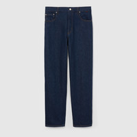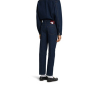 For the Pre-Fall 2025 collection, denim pieces with subtle details elevate everyday looks. Cut from a dark blue washed cotton denim, these slim fit pants reveal a Web detail and Gucci Rooso Ancora naplak label. - Dark blue washed cotton denim - Web detail - Gucci Rosso Ancora naplak label - Five-pocket style - Cropped - Button and zip fly closure - Slim fit - Total length: 40.6"; Waist: 17.3"; Hips: 20.1"; Hem width: 7.9"; based on a size 34 - Made in Italy