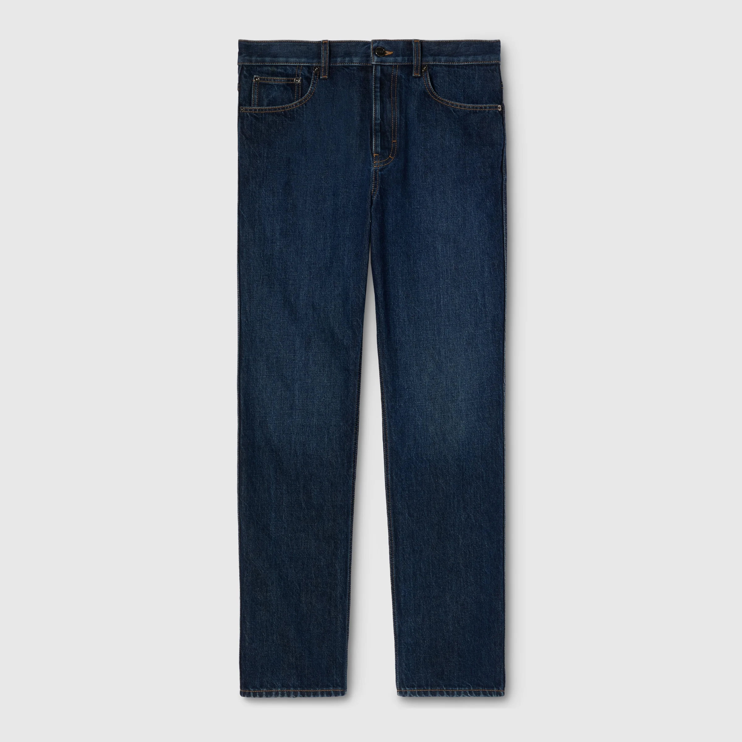 Refined washes, precise construction, and design coherence elevate denim pieces, bridging the House's legacy and what's next. This pair of slim fit cotton denim pants is defined by a naplak label on the back, adding a distinctive touch. - Blue washed certified cotton denim - Gucci Rosso Ancora naplak label - Five-pocket style - Belt loops - Button and zip fly closure - Slim fit - Total length: 41.3"; Hem width: 7.5"; based on a size 32