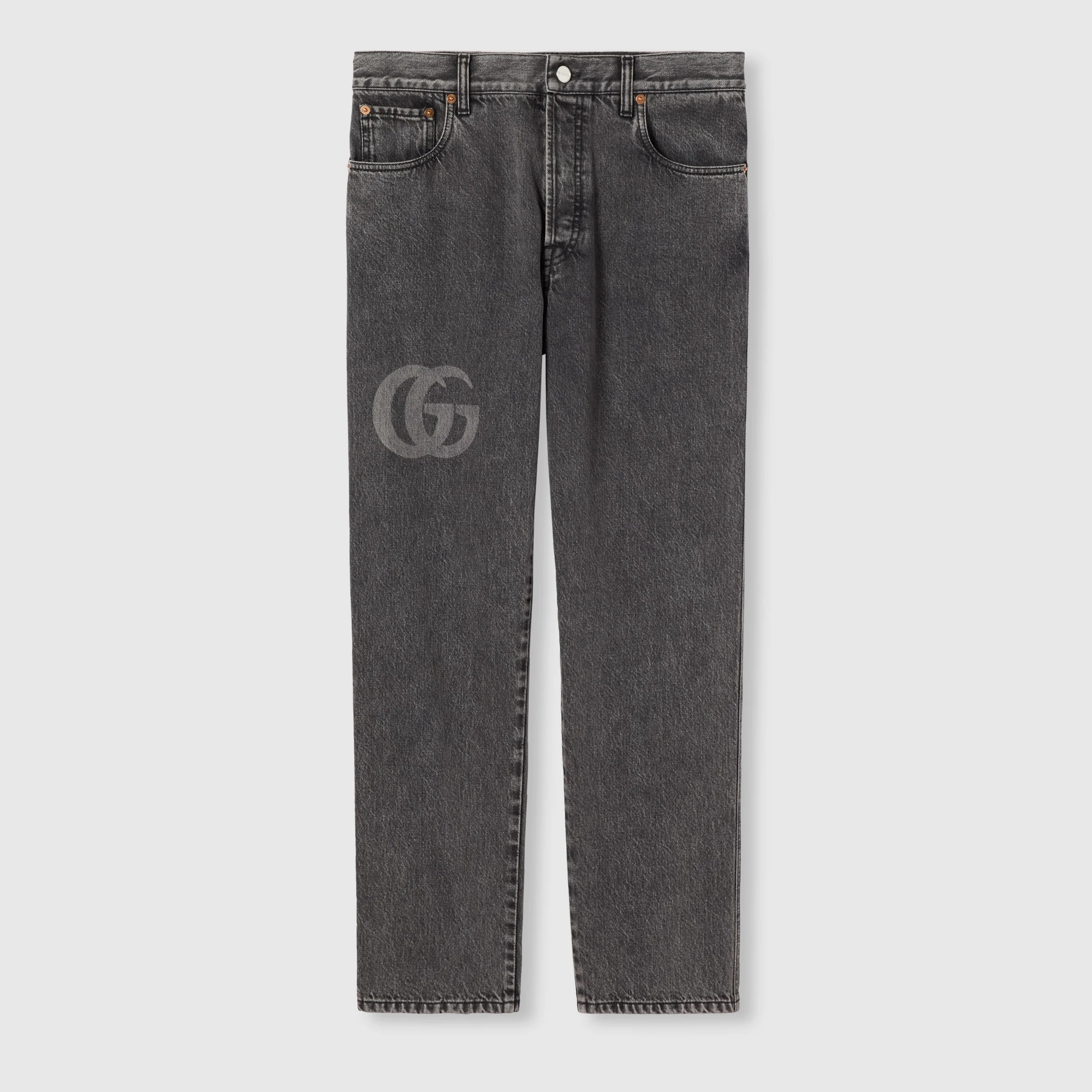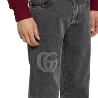 For the Pre-Fall 2025 collection, denim pieces with subtle details elevate everyday looks. Cut from a grey washed cotton denim, these slim fit pants are defined by a Double G lasered detail and a Gucci jacron label. - Grey washed cotton denim - Double G lasered detail - Gucci jacron label - Five-pocket style - Cropped - Button and zip fly closure - Slim fit - Total length: 40.6"; Waist: 17.3"; Hips: 20.1"; Hem width: 7.9"; based on a size 34 - Made in Italy