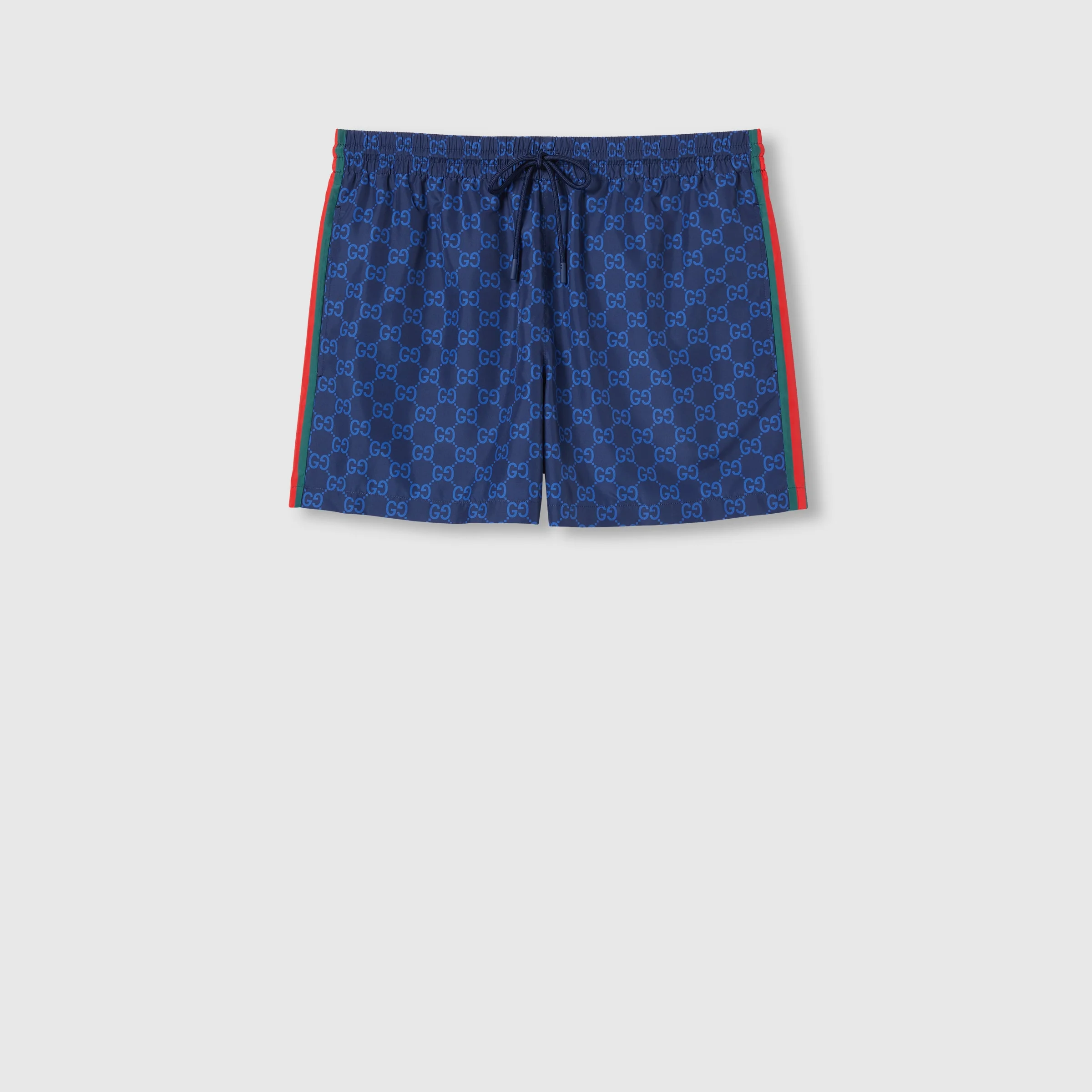 Taking inspiration from founder Guccio Gucci's monogram, the GG motif continues to be a firm favorite of the House. These swim shorts have been made from a poplin tech fabric with an allover GG print and Web stripe print. A matching pouch offers easy storage for days spent at the beach or pool. - Navy poplin tech - Allover GG print - Web stripe print - Elastic waist with drawstring closure - Two side pockets - Back pocket - This item comes with a matching pouch - Please note that intimates, including swimwear, tights, socks and lingerie can only be returned in new condition. Items should be unworn, in their original packaging and with all labels attached. - Length: 15.4"; Waist: 16.3"; Hips: 21.7"; Hem width: 12.8"; based on a size 48 IT - Made in Italy - The product shown in this image is a size 48 (IT)