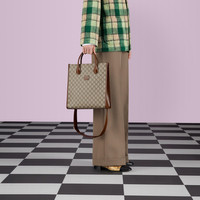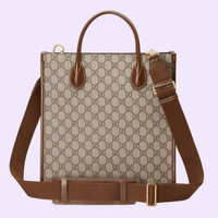 The Interlocking G has remained one of the most symbolic codes of the House since its introduction. The distinguishing emblem appears as a leather detail atop this tote bag. Completing the design's logo feel, the style is crafted from beige and ebony monogram canvas. - Beige and ebony GG Supreme canvas - Brown leather trim - Cotton linen lining - Oval Interlocking G leather tag - Inside: 1 zip pocket - Top handle with 4" drop - Shoulder strap with 24.8" drop - Hook closure - Weight: 2.4lbs approximately - 11.8"W x 13"H x 4.7"D - Made in Italy