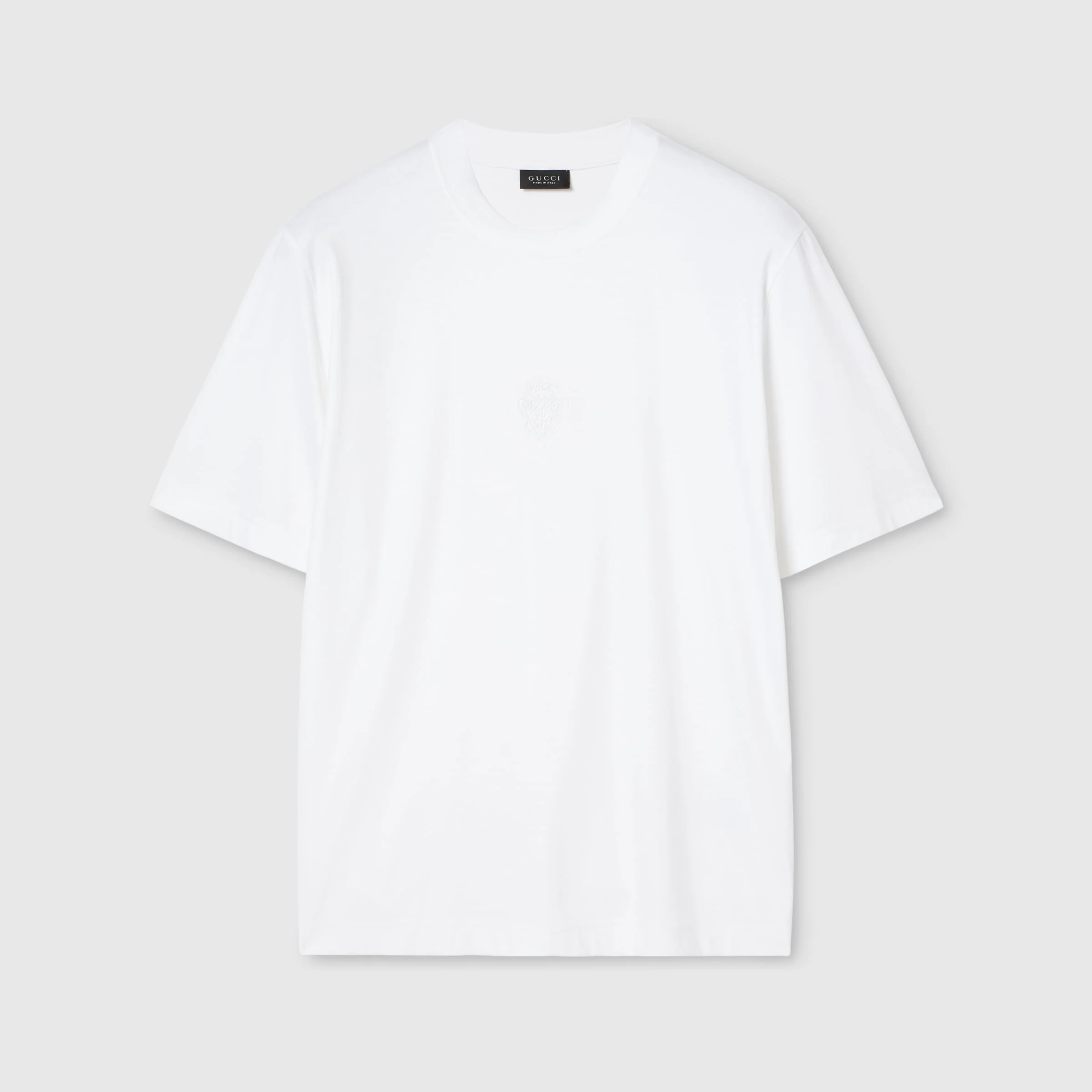 Introducing Spring Summer 2026. This style is inspired by the "L'Introverso" look of La Famiglia. The collection reinterprets the House’s codes through singular personalities and distinctive aesthetic attitudes. Crafted from soft rayon jersey, this T-shirt is enriched with a Gucci crest embroidery. - White soft rayon jersey - Gucci crest embroidery - Crewneck - Length: 24.8", based on a size S - Made in Italy
