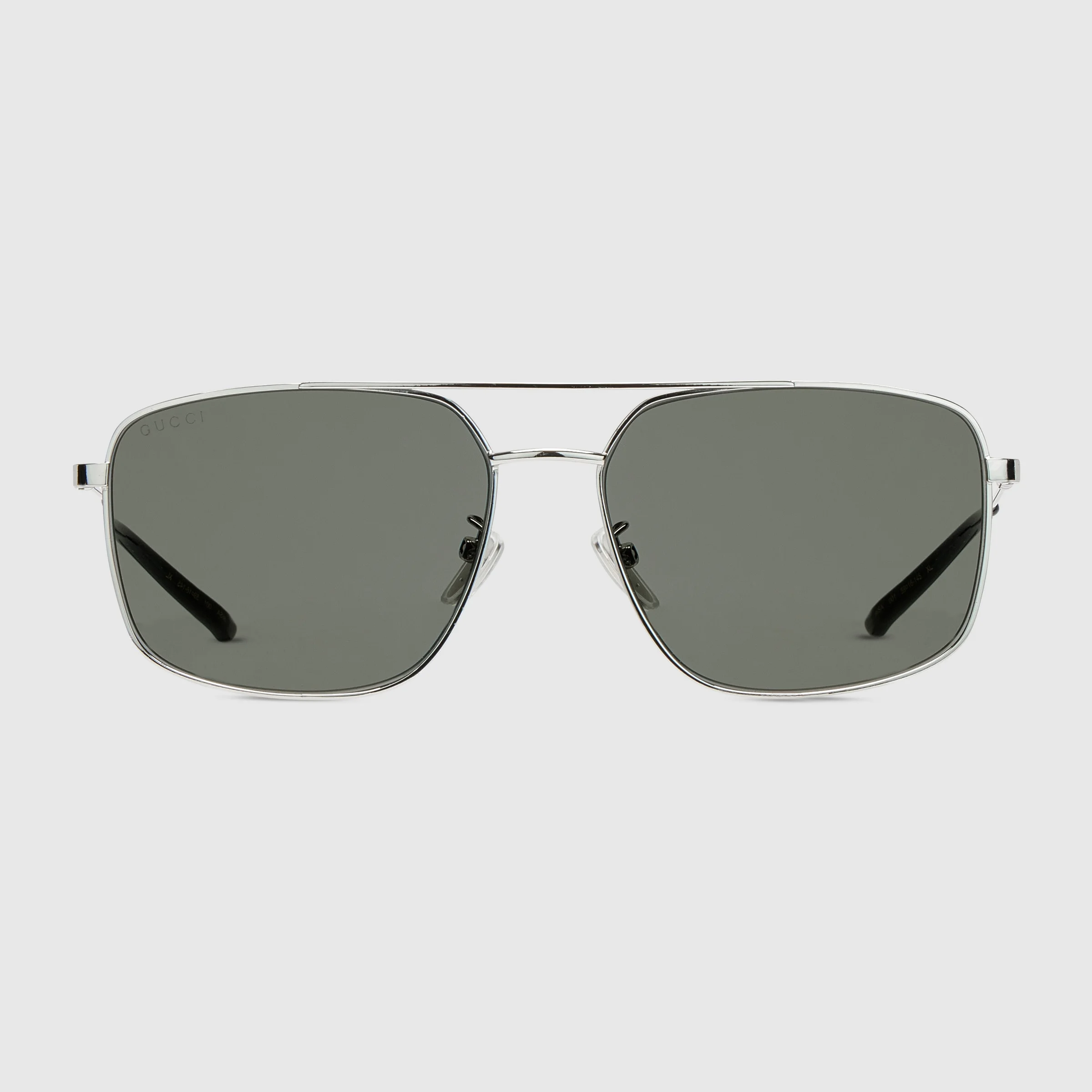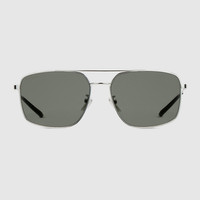 The House's eyewear collection continues to reinterpret emblematic motifs, from the GG, Web, bamboo, Horsebit and equestrian inspirations, in sumptuous materials, intricate craftsmanship, and fresh hues. These specialized fit navigator sunglasses are presented in silver-toned metal with a Web detail across the temples. - Shiny silver-toned metal frame - Shiny silver-toned metal temples with Web detail and black acetate end tips - Grey lens - 100% UVA/UVB protection - Adjustable nose pads - GG2096SA - Temple length: 5.7"; Lens height: 1.8"; Nose bridge length: 0.6" - Frame height: 5.7"; Frame width: 1.8"; Hinge to hinge: 5.5" - The eyewear case in the House’s signature Rosso Ancora red hue is complete with a magnetic closure and white interior