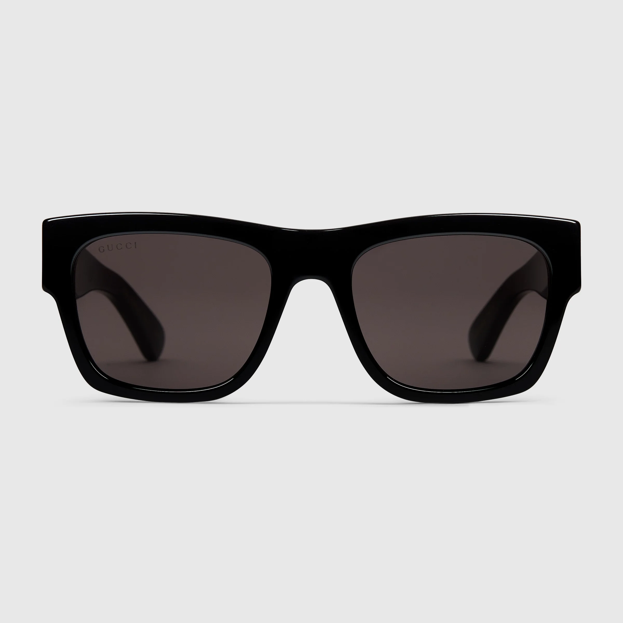 The Cruise 2025 eyewear collection blends an essential silhouette with signature motifs. These square sunglasses are accentuated by a Gucci logo. - Shiny black acetate frame - Shiny black acetate temples with Gucci logo - Solid grey lens - 100% UVA/UVB protection - GG1793S - Temple length: 5.9"; Lens height: 1.7"; Nose bridge length: 0.8" - Frame height 2"; Frame width 5.7"; Hinge to hinge 5.2" - Made in Italy - The eyewear case in the House’s signature Rosso Ancora red hue is complete with a magnetic closure and white interior.