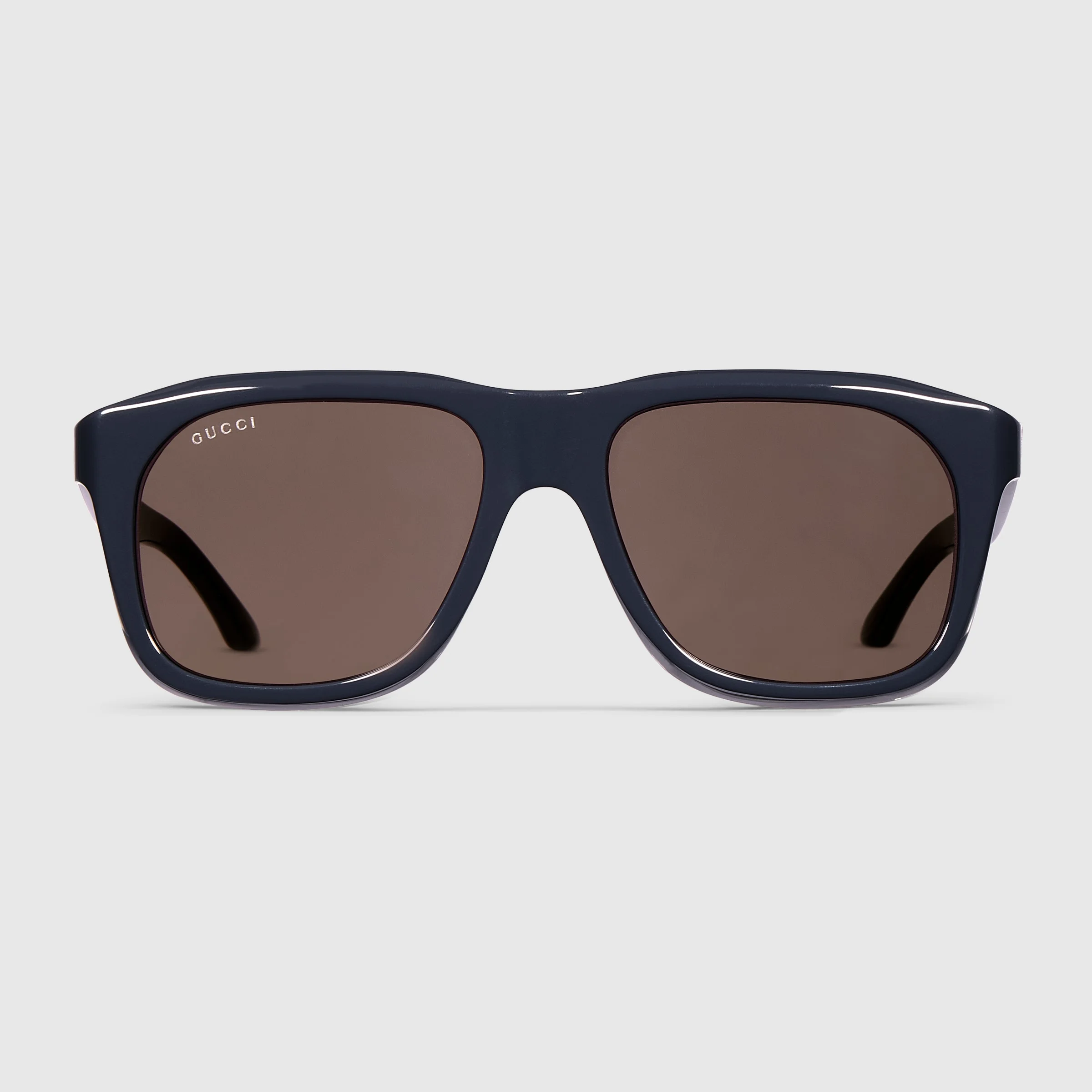 The House's eyewear collection continues to reinterpret emblematic motifs, from the GG, Web, bamboo, Horsebit and equestrian inspirations, in sumptuous materials, intricate craftsmanship, and fresh hues. These square frame sunglasses are presented in dark blue acetate and feature an engraved Gucci plaque. - Shiny dark blue acetate frame - Shiny dark blue acetate temples with engraved Gucci plaque - Brown lens - 100% UVA/UVB protection - GG2077S - Temple length: 5.7"; Lens height: 1.7"; Nose bridge length: 0.6" - Frame height: 5.7"; Frame width: 2"; Hinge to hinge: 5.1" - The eyewear case in the House’s signature Rosso Ancora red hue is complete with a magnetic closure and white interior