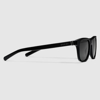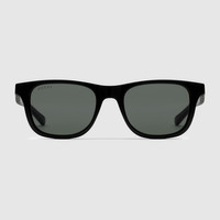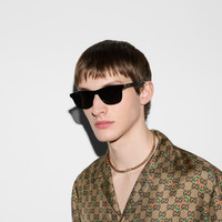 The Pre-Fall 2024 eyewear collection puts a twist on the iconic Web which adorns signature silhouettes. In this square style, a subtle silver-toned metal detail draws inspirations from the House motif, and completes the black acetate frame and temples. - Shiny black acetate frame - Shiny black acetate temples with Gucci logo and silver-toned metal detail - Solid grey lens - 100% UVA/UVB protection - GG1671S - Temple length: 5.7"; Lens height: 1.6"; Nose bridge length: 0.75" - Frame height 1.7"; Frame width 5.3" - Made in Italy - The Rosso Ancora packaging, a distinctive color chosen by Creative Director Sabato De Sarno to mark the beginning of Gucci's new creative chapter, includes a vinyl case and satin pouch.
