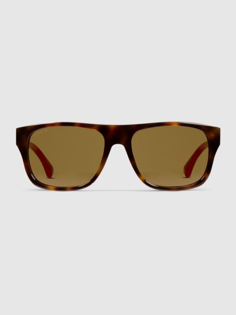 The House's eyewear collection continues to reinterpret emblematic motifs, from the GG, Web, bamboo, Horsebit and equestrian inspirations, in sumptuous materials, intricate craftsmanship, and fresh hues. Presented in shiny transparent blue acetate, these square frame sunglasses reveal Web temples and a Gucci logo detail. - Shiny transparent blue acetate frames - Shiny green and red Web acetate temples with Gucci logo - Dark blue lens - 100% UVA/UVB protection - GG2119S - Temple length: 5.7"; Lens height: 1.7"; Nose bridge length: 0.6" - Frame height: 5.6"; Frame width: 1.8"; Hinge to hinge: 5.1" - The eyewear case in the House’s signature Rosso Ancora red hue is complete with a magnetic closure and white interior