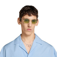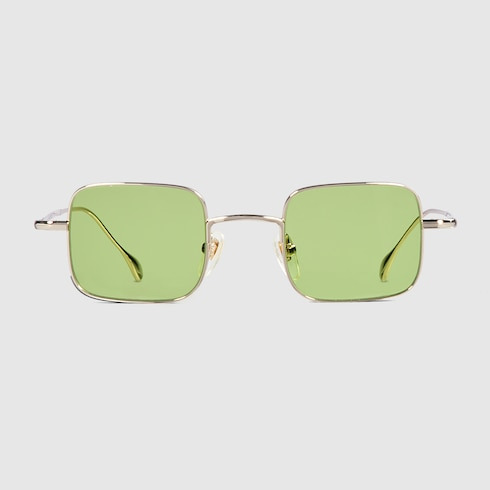 The Pre-Fall 2025 eyewear collection blends statement silhouettes from the archives with a contemporary touch. These square sunglasses are accentuated with an engraved Gucci logo. - Shiny light gold-toned metal frame - Shiny light gold-toned metal temples with engraved Gucci logo - Solid bright green lens - 100% UVA/UVB protection - GG1813S - Temple length: 5.7"; Lens height: 1.4"; Nose bridge length: 0.9" - Frame height 1.4"; Frame width 4.9"; Hinge to hinge 4.7" - Made in Japan - The eyewear case in the House’s signature Rosso Ancora red hue is complete with a magnetic closure and white interior.