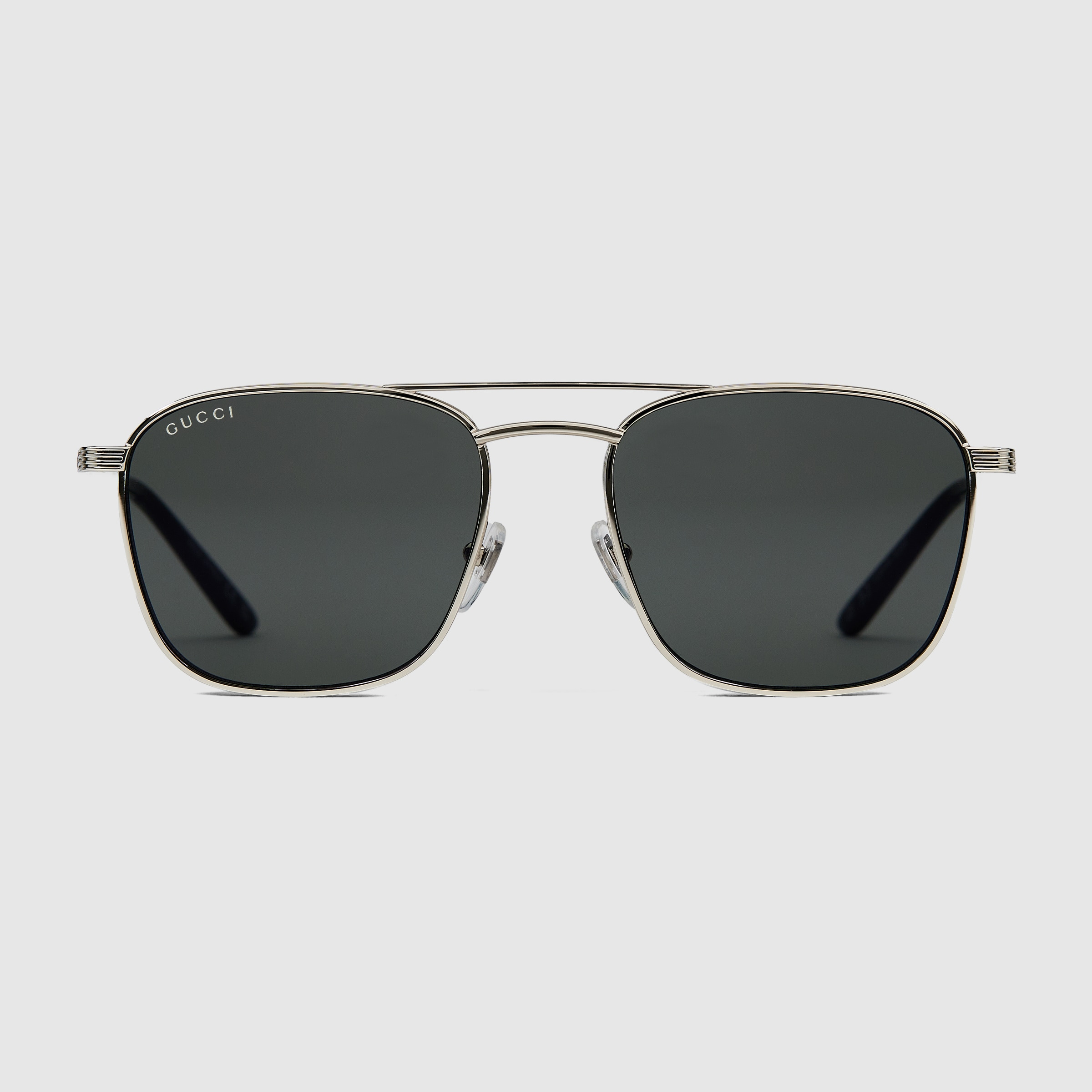 The Cruise 2025 eyewear collection blends a square silhouette and signature motifs in a classic design. These sunglasses feature unique tips, and engraved Gucci logo on the temples. - Shiny silver-toned metal frame - Shiny silver-toned metal temples with black tips and engraved Gucci logo - Solid grey lens - 100% UVA/UVB protection - GG1881S - Temple length: 5.7"; Lens height: 1.8"; Nose bridge length: 0.7" - Frame height: 1.8"; Frame width: 5.5"; Hinge to hinge: 5.2" - Made in Italy - The eyewear case in the House’s signature Gucci Rosso Ancora red hue is complete with a magnetic closure and white interior.