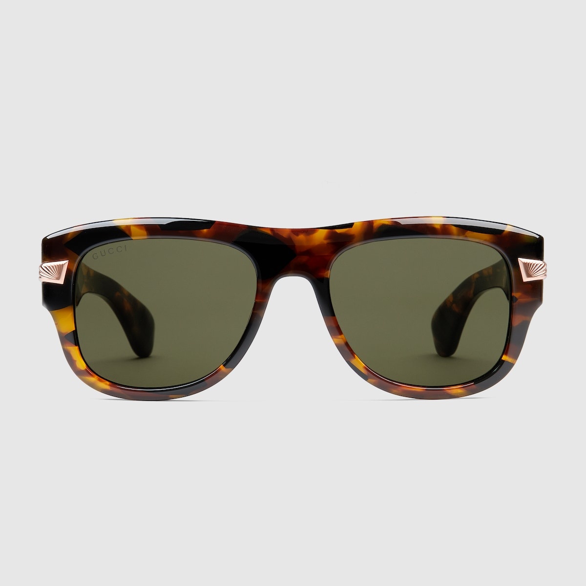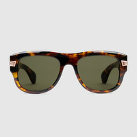 Presented in a shiny dark tortoiseshell acetate frame, these square-frame sunglasses feature gold-toned Gucci engraved detail across the matching temples. A solid grey lens completes the design. - Shiny dark tortoiseshell acetate frame - Shiny dark tortoiseshell temples with metal gold-toned Gucci engraved detail - Solid dark grey lens - 100% UVA/UVB protection - GG1517S - Temple length: 5.7', lens height: 1.7', nose bridge length: .07' - Frame height: 2"; Frame width: 5.7" - Made in Japan - The glasses will arrive in a velvet case, available in a range of six jewel-toned colors, and paired with a coordinating satin lining. The case color will be individually selected for each pair of glasses, and comes with a matching satin flannel pouch and ivory microfiber cloth.