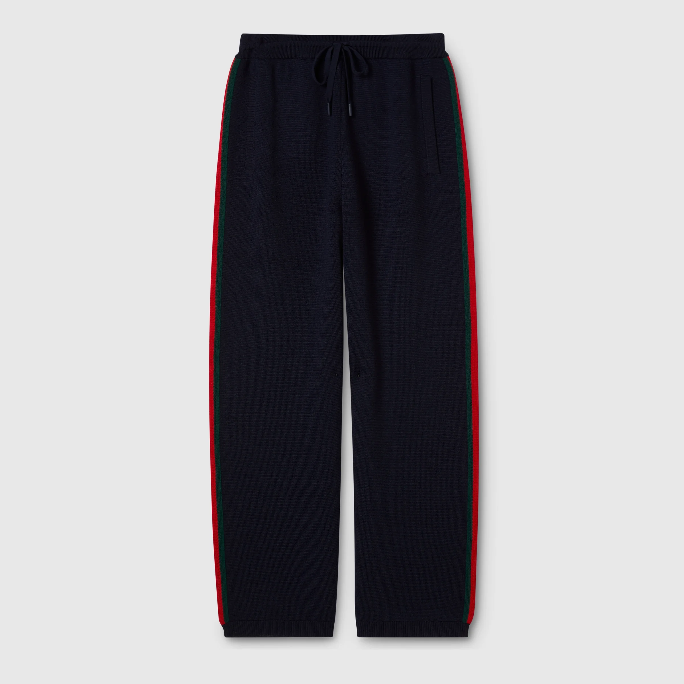 The GG, the logo and the Web embody the brand's legacy, Italian roots, and commitment to savoir-faire, expressed through carefully executed techniques. This pair of leisure pants is made from woven stitch wool and enriched with Web inserts. - Dark blue woven stitch knit wool - Web inserts - Elastic waistband with drawstring - Side pockets - Back pocket - Length: 42.1"; based on a size S