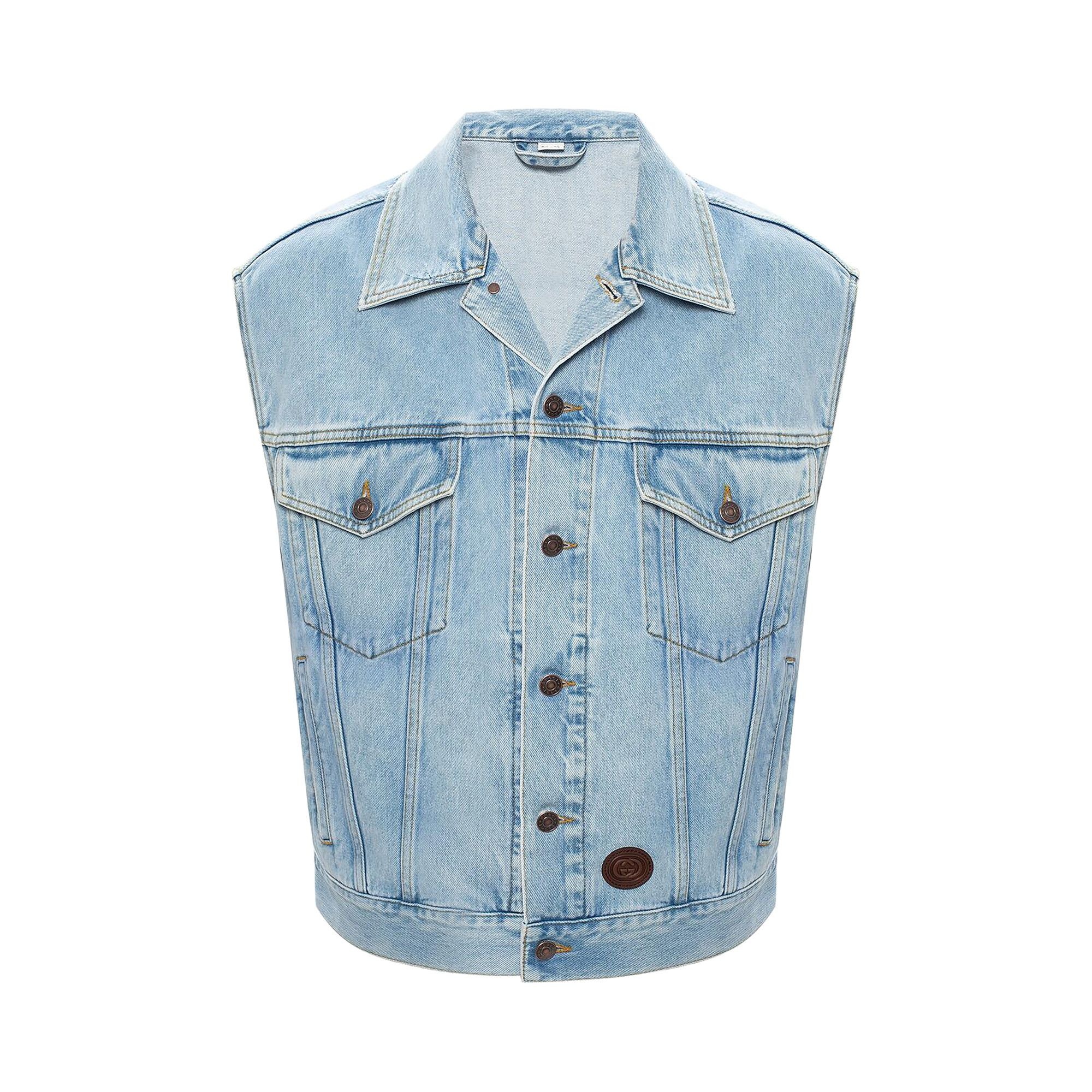 Gucci makes a strong statement in denim, reworking the cult fabric in different shapes and treatments. Imagined as a complement for layered looks, this vest is presented in light blue stone-bleached denim, with an underground appeal outbalanced by the Interlocking G leather tag. The House’s most emblematic codes from the archives are rejuvenated in a refreshing mix of classic and contemporary that speaks to a new aesthetic. - Marble stone-bleached light blue denim with contrast stitching - Silver-toned metal buttons - Leather Interlocking G tag - Unlined - Point collar with raw cut edges - Front pockets - 100% cotton - Made in Italy - The model is 6' tall. The product shown in this image is a size 46 (IT)