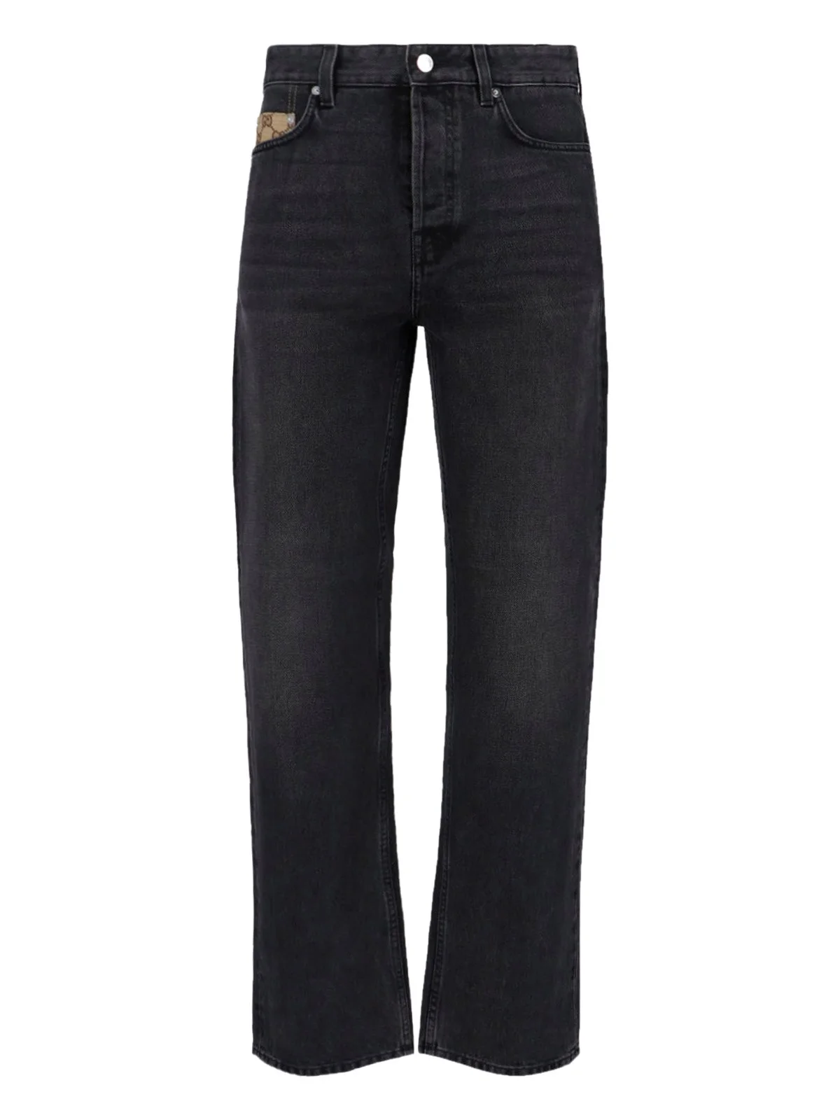 GUCCI STRAIGHT JEANS IN BLACK COTTON DENIM WITH MEDIUM VIUTA, BUTTON CLOSURE, FIVE POCKET DESIGN, "GG SUPREME" PATTERN DETAILS ON THE FRONT AND BACK, LOGO PATCH ON THE BACK, STRAIGHT LEG. PRODUCT INFO PRODUCT CODE 852359 XDDE51000 COMPOSITION: 100% TEXTILE SIZE AND FIT: REGULAR FIT MADE IN: ITALY