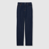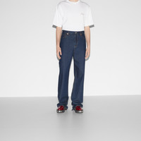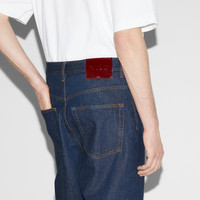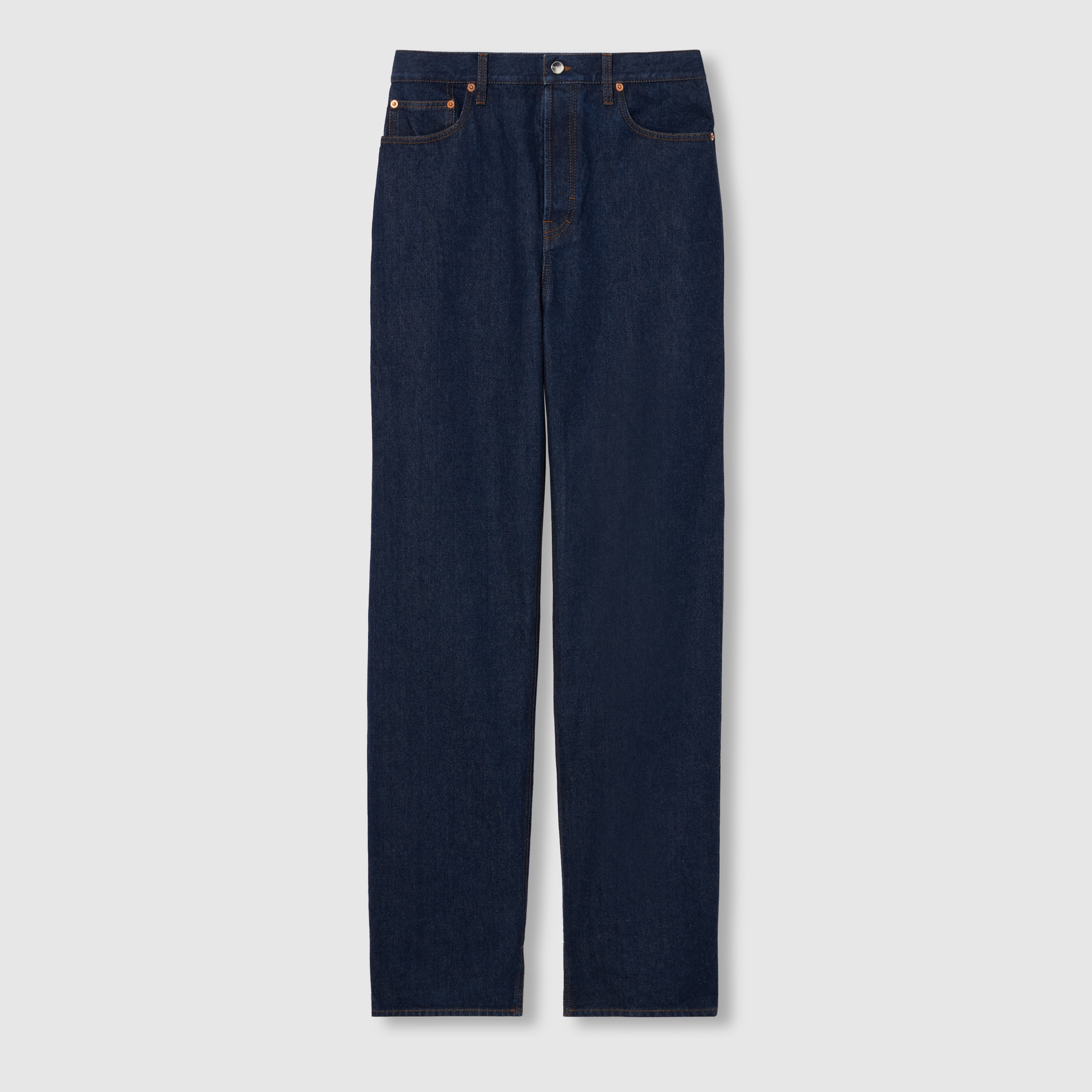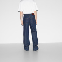 Creative Director Sabato De Sarno reinvents the essential men's wardrobe for the Fall Winter 2024 collection, with wearabilty and fit becoming key statements. Classic denim pants combine romanticism with a soft punk aesthetic. The Gucci Rosso Ancora naplak label completes this baggy style. - Dark blue denim - Gucci engraved buttons - Gucci Rosso Ancora naplak label - Five-pocket style - Split hem - Waist: 17"; based on a size 32 (IT) - Hips: 20.7"; based on a size 32 (IT) - Hem width: 9.8"; based on a size 32 (IT) - Button and zip closure - Baggy fit - Length: 49" based on a size 32 - Leg opening: 9.8" based on a size 32 - Made in Italy - The product shown in this image is a size 32