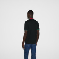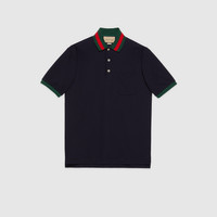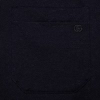 Defined by the contrast stripes on the collar and the Double G symbol, this navy cotton piquet polo draws upon Gucci's history. - Navy stretch cotton piquet - Double G embroidery - Short sleeves - Chest patch pocket - Side vents - Back length: 29,5"; based on size M - Button-through placket - Regular fit - Made in Italy - The model is 6" tall. - Shoulder width: 18,7"; based on a size M