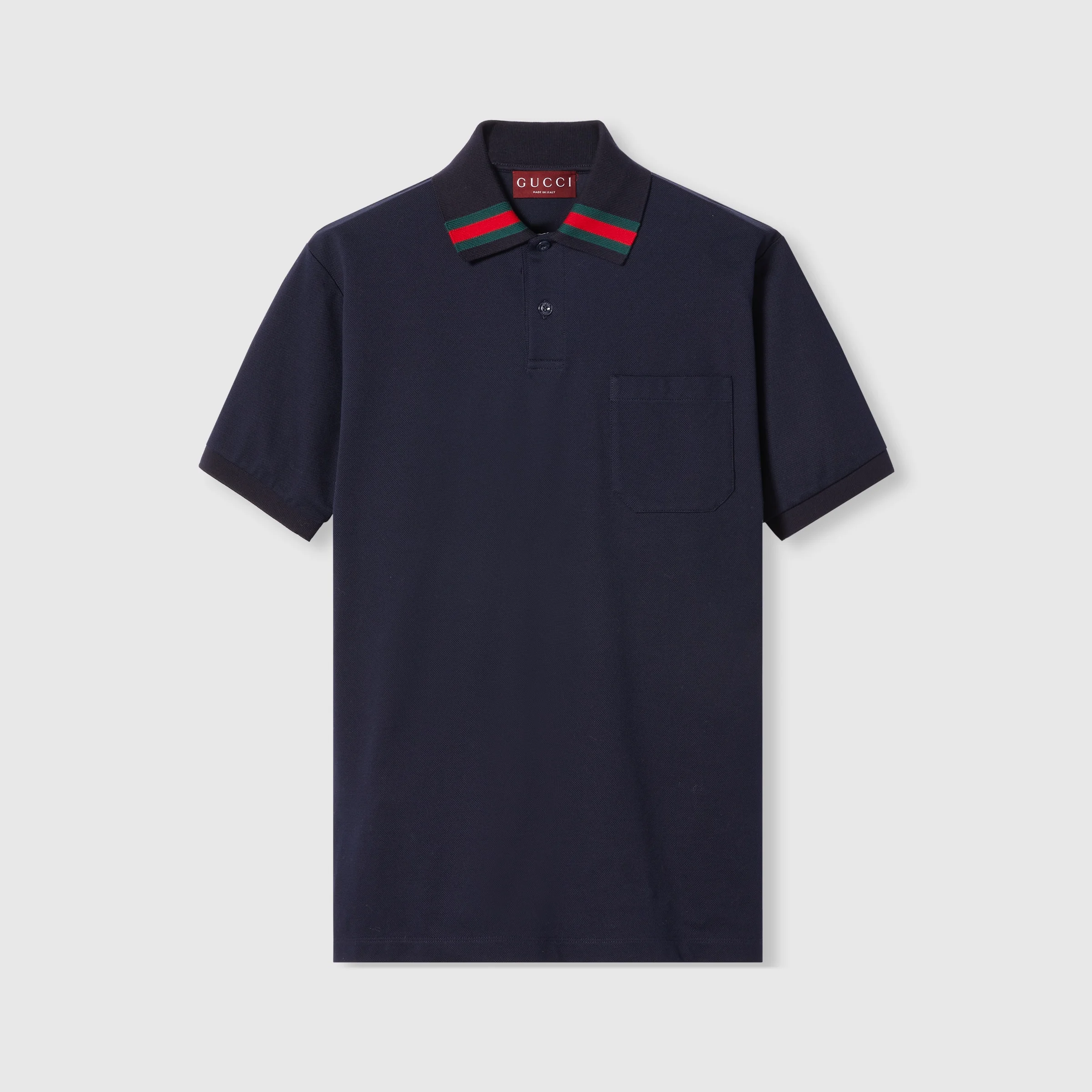 The Web is being re-envisioned as patterns and unique details through complex constructions and stitching techniques that elevate knitwear and more pieces from mere sportswear to iconic masterpieces. This regular fit polo shirt is presented in a stretch cotton piquet and defined by a green and red Web detail across the collar. - Navy stretch cotton piquet - Polo collar with Web detail - Dropped shoulder - Short sleeves - Chest pocket - Rib trim - Shoulder drop: 18.1"; based on a size S - Chest: 21.6"; based on a size S - Sleeves length: 9.2"; based on a size S - Button closure - Regular fit - Length: 28.7"; based on a size S - Made in Italy - The product shown in this image is a size small