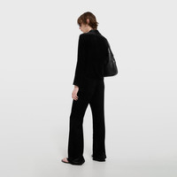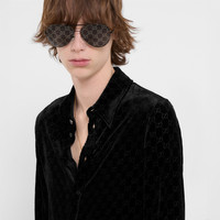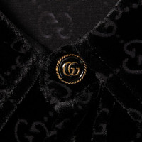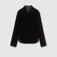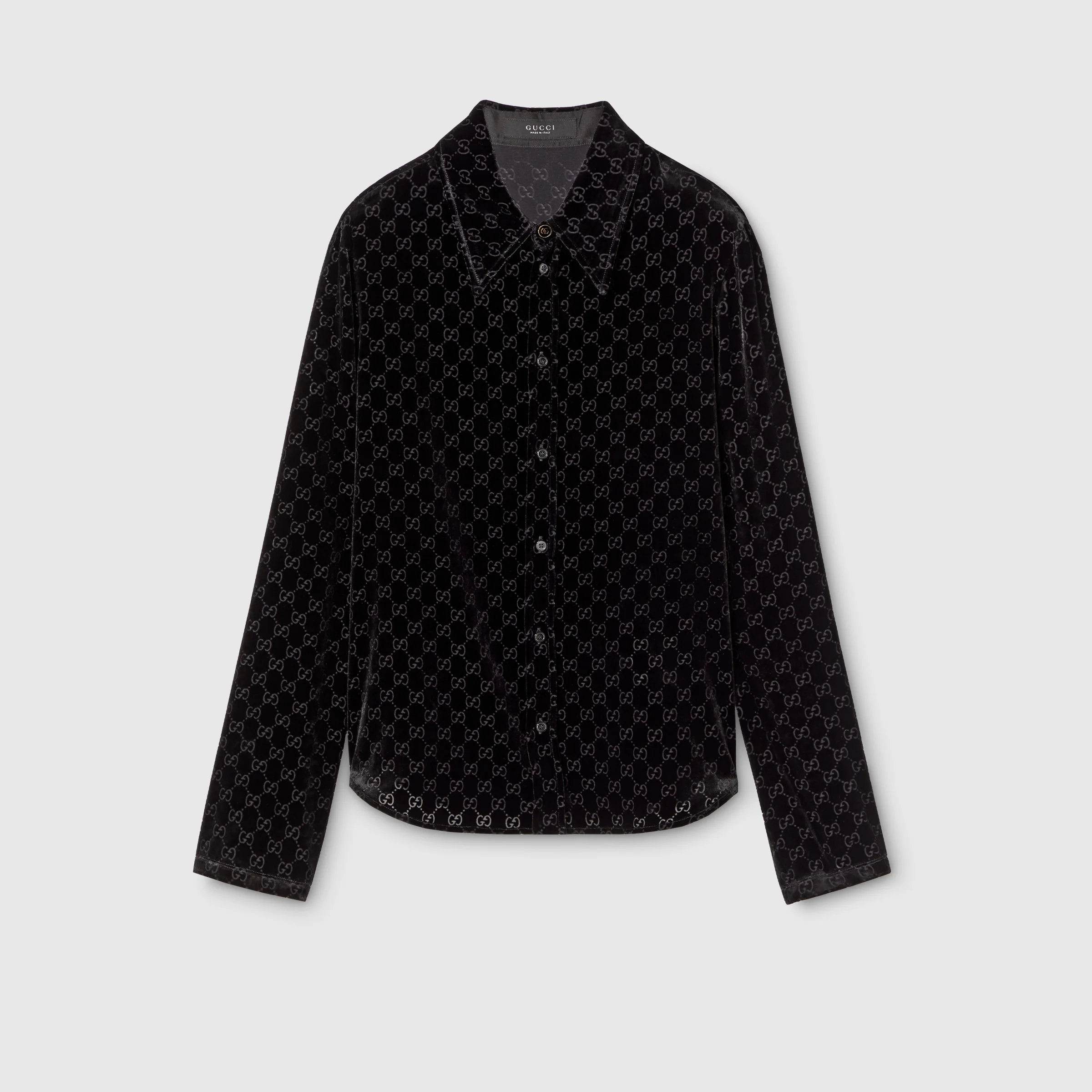 Introducing Spring Summer 2026. This style is featured as part of the "Principino" look of La Famiglia, which reinterprets the House’s codes through singular personalities and distinctive aesthetic attitudes. Crafted from stretch GG velvet devore, this shirt is finished with Double G buttons. - Black stretch GG velvet devore - Double G button - Point collar - Long sleeves - Front button closure - Cropped fit - Length: 24"; Sleeves length: 31.8", based on a size 44(IT) - Made in Italy - Fabric: 72% Viscose, 24% Silk, 4% Elastane - Details: 100% Silk