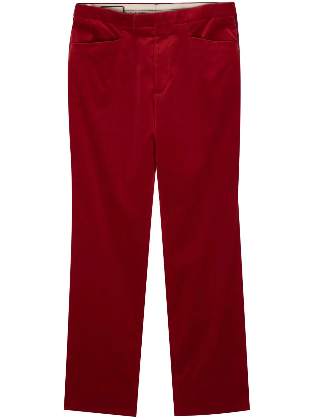 velvet straight trousers Gucci's Aria collection celebrates 100 years of the house. The brand presents a contemporary take on velvet suiting for SS22, showcasing more casual designs such as these stretch-velvet trousers with a satin side stripe. Highlights - Blood red - Cotton blend - Velvet - Two side slash pockets - Side stripe detailing - Pressed crease - Two rear button-fastening jetted pockets - Straight leg - Concealed front button, hook and zip fastening Made in Italy Composition Outer: Cotton 98%, Elastane 2% Silk 100% Washing instructions Dry Clean Only