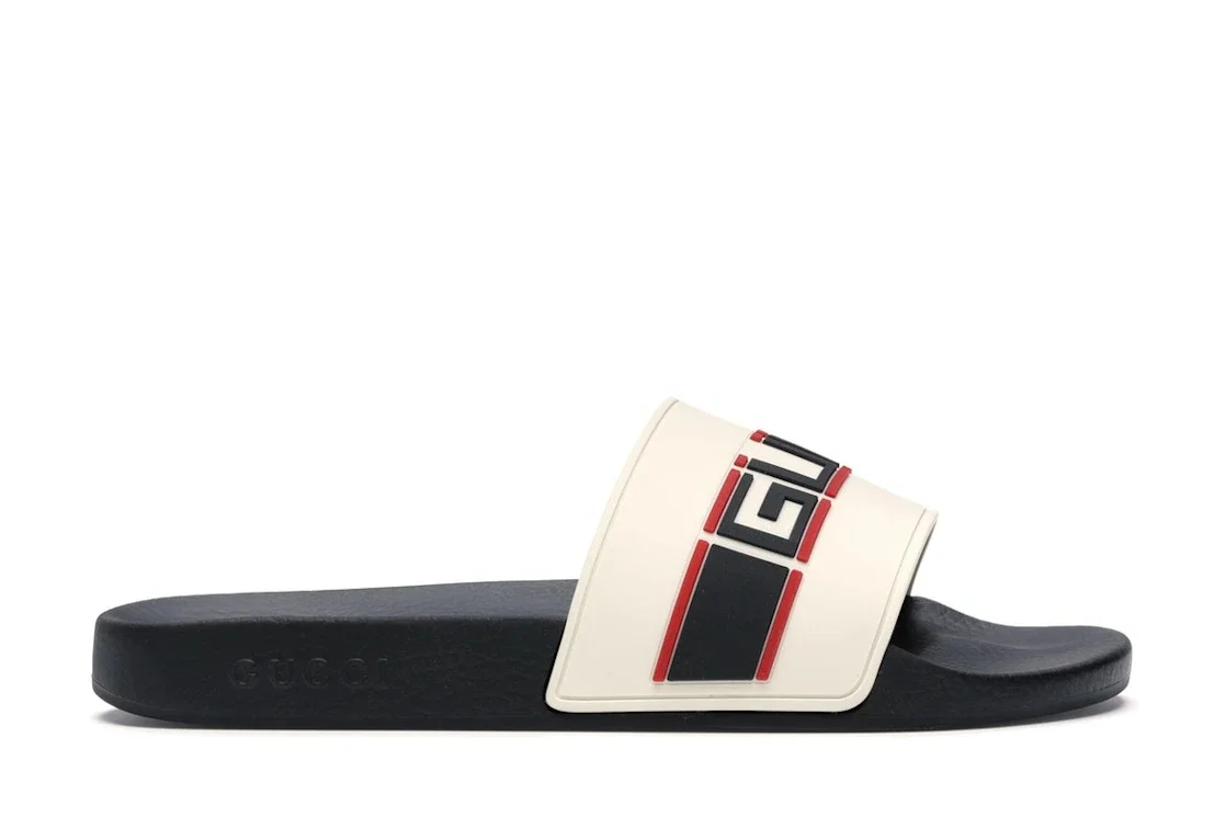 A new distinct detail of the House, the Gucci jacquard stripe draws inspiration from tape logos running down the sides of vintage tracksuits from the '80s. For Pre-Fall 2018 the sporty motif is reworked in rubber, enhancing the front of a slide sandal. - White rubber with red and black Gucci stripe - Men's - Molded rubber footbed - Gucci logo embossed on the sole - .6" height - Made in Italy