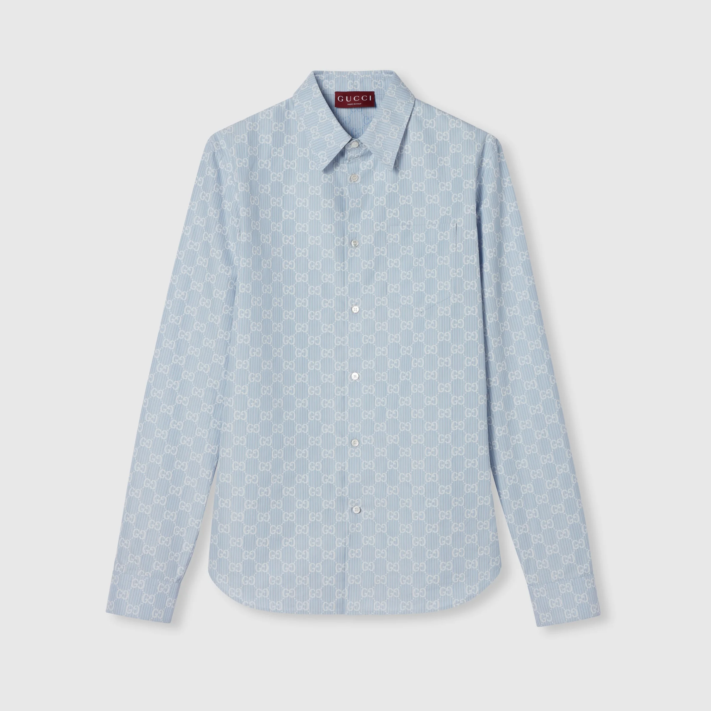 For the Pre-Fall 2025 collection, a leisure-inspired approach to formalwear introduces new silhouettes and cuts. Signature elements are combined with refined details. This shirt appears in light blue striped GG cotton jacquard. - Light blue striped GG cotton jacquard - Point collar - Front chest pocket - Long sleeves - Front button closure - Made in Italy