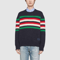 Part of a classic knitwear line that reinterprets traditional patterns through the Gucci lens, the blue felted wool alpaca crewneck sweater is highlighted by bold stripes in the House's defining colors: green and red. An intricate GG embroidery emphasizes the connection with Gucci's heritage. - Blue felted wool alpaca blend with green, red and white stripes - GG embroidery - Crewneck - Rib trims - Length: 25.5" based on a size small - 50% wool and 50% alpaca - Made in Italy - The product shown in this image is a size small. The model is 6'1" tall.
