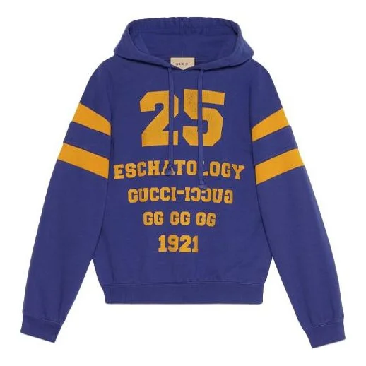 This heavy cotton jersey sweatshirt features the number 25, the Creative Director’s lucky number, alongside the year 1921, the year of the House’s founding. Ever more thought provoking, ‘Eschatology’, a doctrine that explores the ultimate destiny of humans and the universe, and 'Blind for Love’, an evolution of the original 'L'Aveugle Par Amour,’ are printed on the front and back. - Blue stone washed heavy cotton jersey with "25 Gucci Eschatology Blind for Love 1921" print - Fixed hood with drawstring closure - Contrast stripes at the sleeve - Ribbed hem and cuffs - Made in Italy - The model is 6'1" tall. The product shown in this image is a size medium