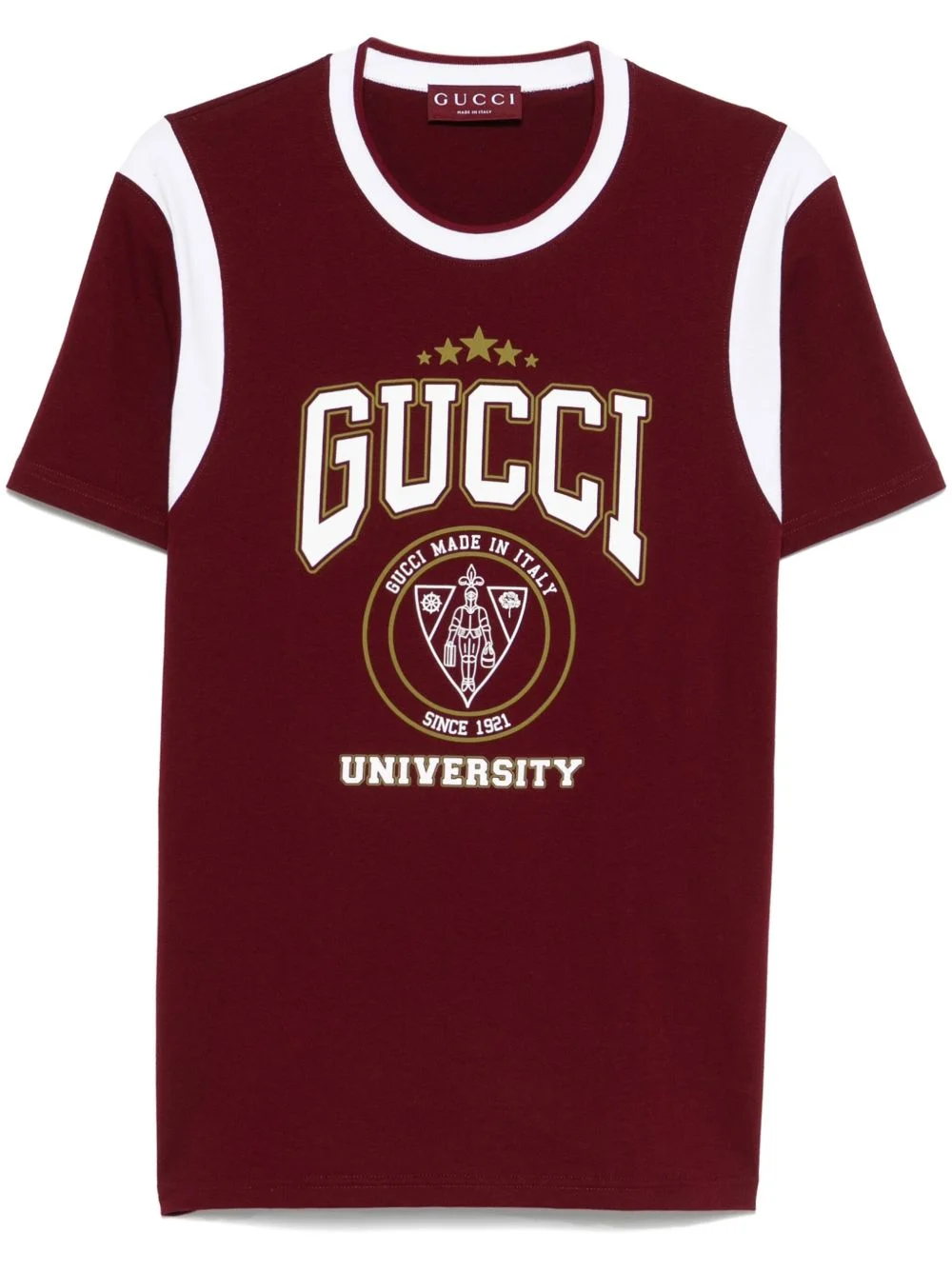 logo-print T-shirt Highlights - Burgundy - Crest motif - Crew neck - Short sleeves Made in Italy Composition Cotton 100% SIZE & FIT Model measurements Height 6 ft 0 in(1.84 m) Bust/Chest 35.82 in(91 cm) Hips 37 in(94 cm) Waist 28.34 in(72 cm) FittingInformation Designed for a relaxed fit, this piece allows for comfort and movement when worn Made from a midweight non-stretch fabric, this piece offers minimal elasticity when worn Washing instructions Machine Wash